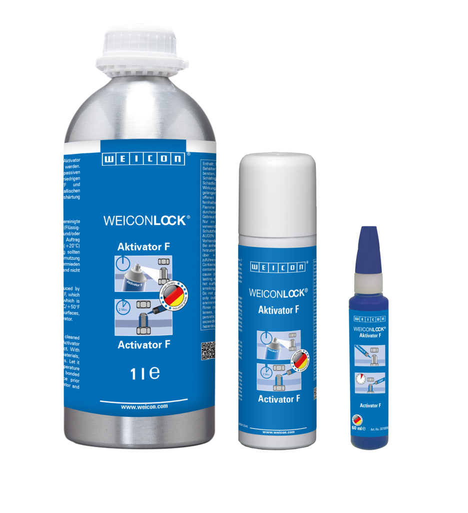 El Activador F WEICON permite reducir considerablemente el tiempo de endurecimiento. Es recomendable utilizar también el Activador para todas las superficies pasivas y siempre a bajas temperaturas ambientales (a partir de +10 °C/+50 °F y menores) y para ranuras de gran tamaño. Si se trata de superficies no metálicas, WEICONLOCK puede endurecerse solamente con el activador.