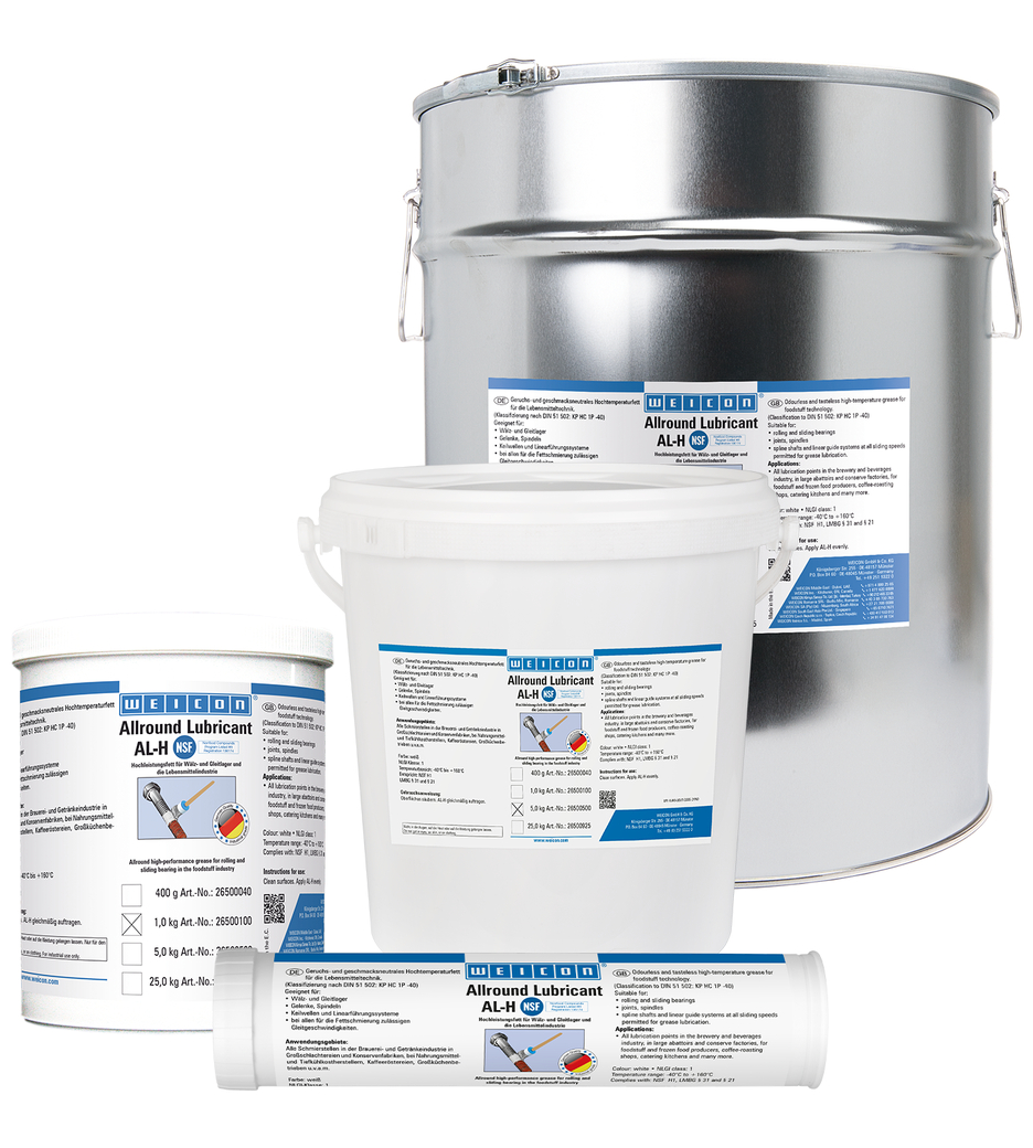 WEICON AL-H es adecuado para rodamientos y cojinetes de deslizamiento, articulaciones, husillos, ejes estriados y sistemas de guías lineales a todas las velocidades de deslizamiento permitidas para la lubricación con grasa. Gracias a su formulación especial y a la homologación NSF H1, AL-H es especialmente adecuado para su uso en la tecnología de procesamiento de alimentos.