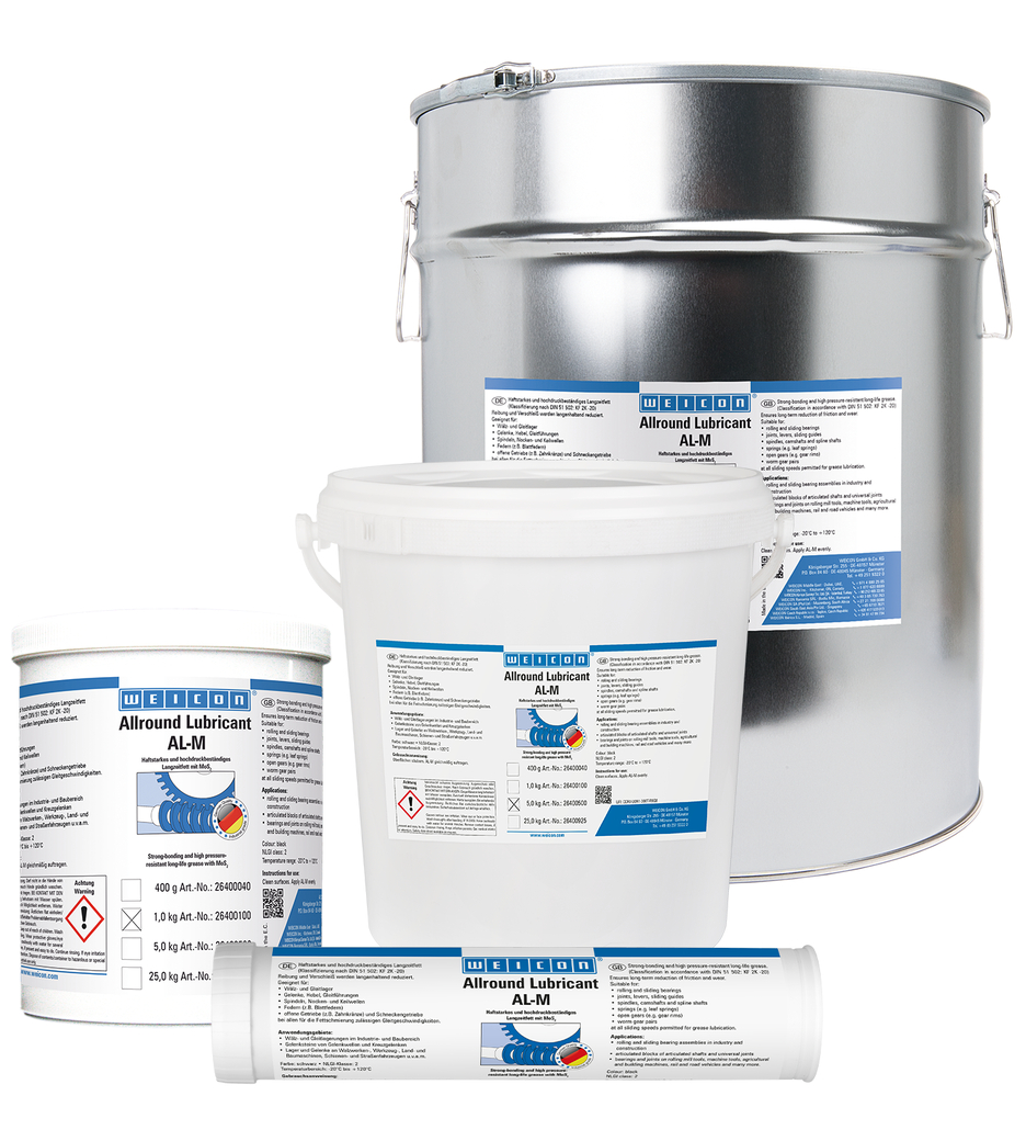 WEICON AL-M reduce permanentemente la fricción y el desgaste y es adecuado para rodamientos y cojinetes de deslizamiento, articulaciones, palancas, guías de deslizamiento, husillos, árboles de levas, ejes estriados, muelles, transmisiones abiertas, engranajes helicoidales y para todas las velocidades de deslizamiento permitidas para la lubricación con grasa.
