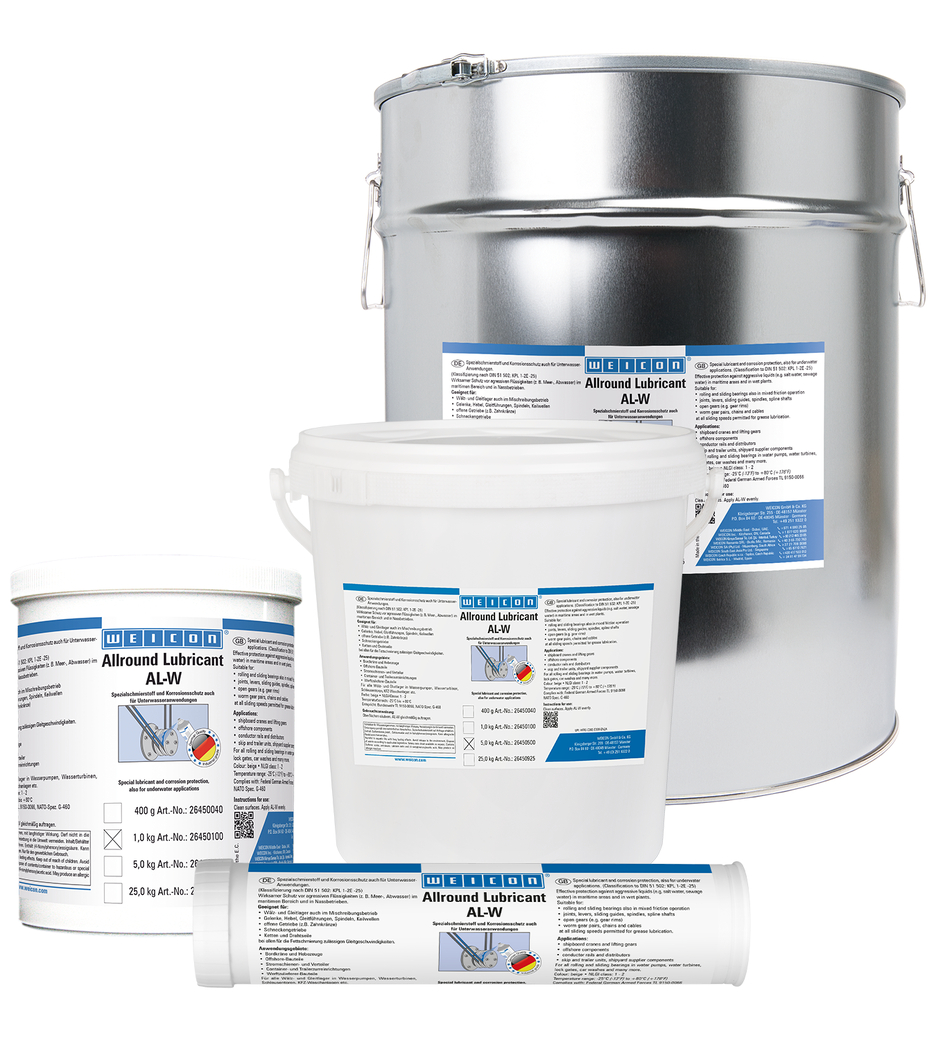 WEICON AL-W ofrece una protección eficaz contra líquidos agresivos como el agua de mar o las aguas residuales, tanto en el sector marítimo como en aplicaciones húmedas. El lubricante es adecuado para cojinetes de rodillos y de deslizamiento incluso en funcionamiento de fricción mixta, para articulaciones, palancas, guías de deslizamiento, husillos, ejes estriados, engranajes abiertos, engranajes helicoidales, cadenas y cables metálicos, a todas las velocidades de deslizamiento permitidas para la lubricación con grasa.