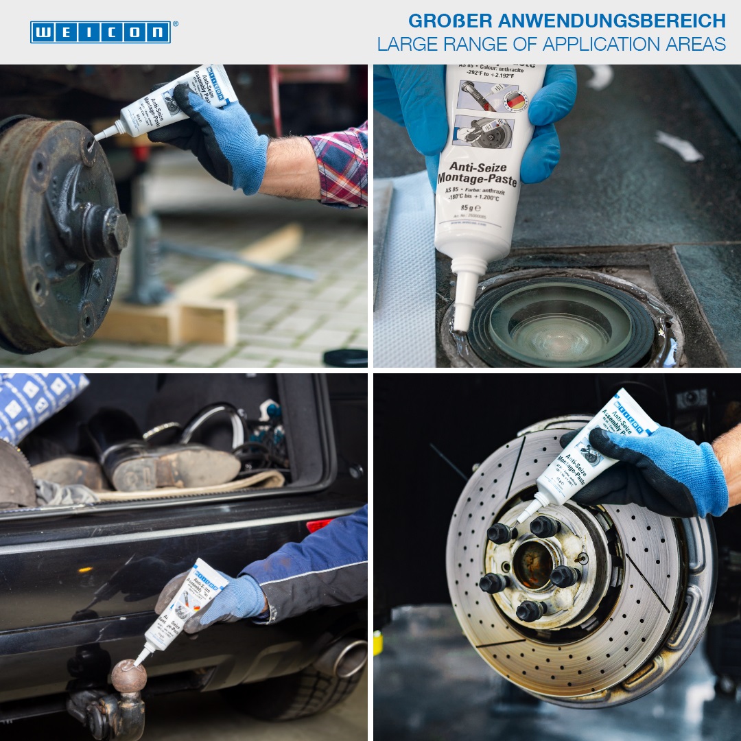 WEICON Anti-Seize es resistente a altas temperaturas y dispone de un extraordinario efecto separador. El Anti-Seize se usa como sustancia protectora, antiadherente y lubricante para piezas de servicio pesado. Las partes sólidas ajustadas óptimamente entre sí y los aditivos seleccionados ofrecen una amplia gama de aplicaciones. Anti-Seize protege contra la corrosión, agarrotamiento y desgaste, deslizamientos intermitentes, oxidación, herrumbre de contacto y reacciones electrolíticas («soldadura en frío»).