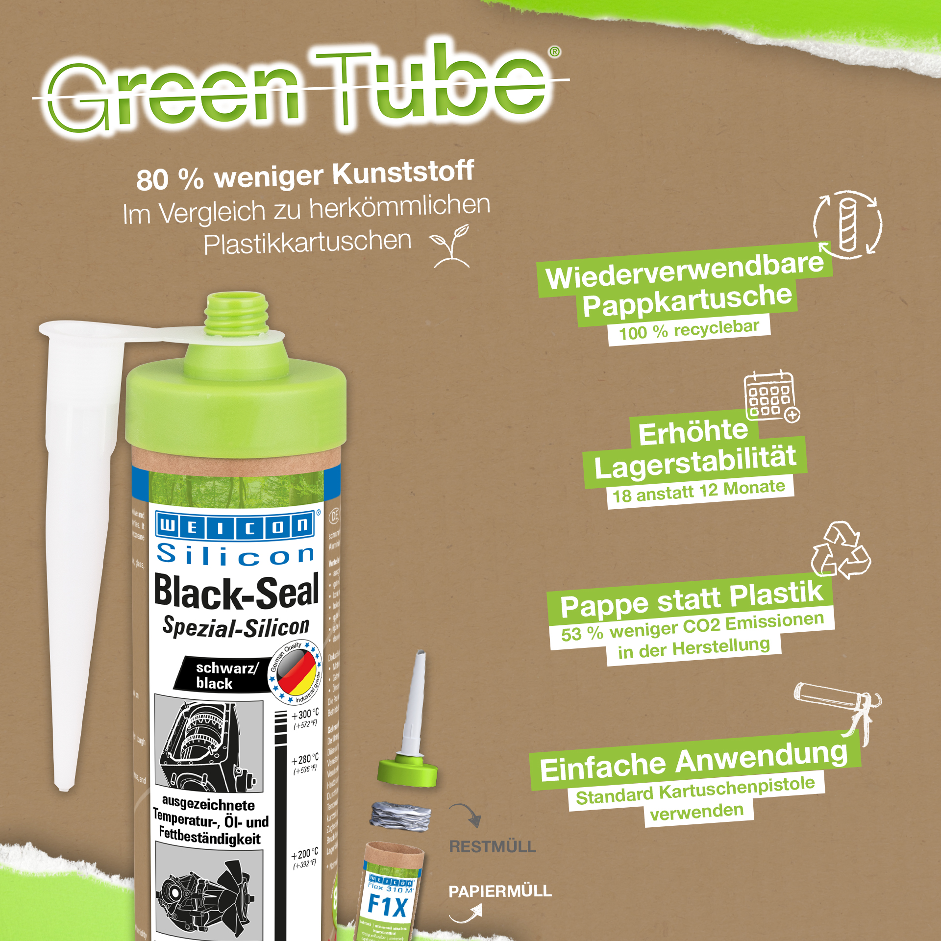 WEICON Black-Seal es resistente a altas temperaturas (+280 °C/+536 °F), exento de diluyentes, de gran adherencia, resistente a la presión, al envejecimiento y extremamente elástico (alargamiento a la rotura de aprox. 500%). Adecuado para pegar y sellar piezas que requieren una resistencia especialmente alta a los aceites y grasas. El producto puede aplicarse en las tapas de transmisiones, válvulas y carcasas, cárteres de aceite y bombas de aceite, bombas de agua, transmisiones, ejes, bridas, tanques, recipientes y numerosos otros campos.