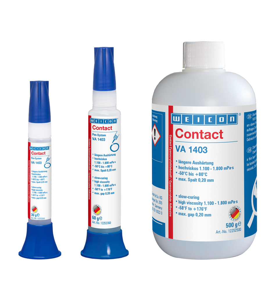 En su estado endurecido es menos suceptible a la humedad. WEICON Contact VA 1403 es apto para uniones limpias y ópticamente atractivas para gran variedad de materiales. WEICON Contact VA 1403 puede aplicarse en numerosos campos de la industria.
