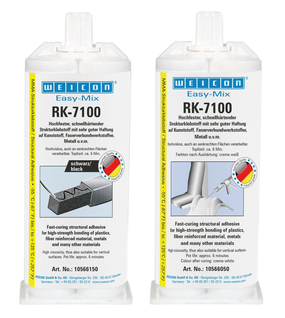 El adhesivo acrílico estructural WEICON Easy-Mix RK-7100 puede ser utilizado para unir numerosos materiales, tales como plásticos, metales y cerámicas entre sí con alta resistencia a la tracción, al cizallamiento y al pelado. Es especialmente adecuado para uniones estructurales donde se requieren conexiones de alta resistencia. Es muy viscoso, por lo que resulta adecuado para su procesamiento en superficies verticales. RK-7100 es de aplicación universal y puede utilizarse, por ejemplo, en la tecnología de plásticos, en la construcción metálica, en la construcción de carrocerías y vehículos, en la ingeniería mecánica, en la ingeniería eléctrica, en la fabricación de modelos y moldes y en la construcción de ferias y exposiciones. La Pistola Dosificadora Easy-Mix D 50 es necesaria para procesar productos Easy-Mix en cartuchos de 50 ml.