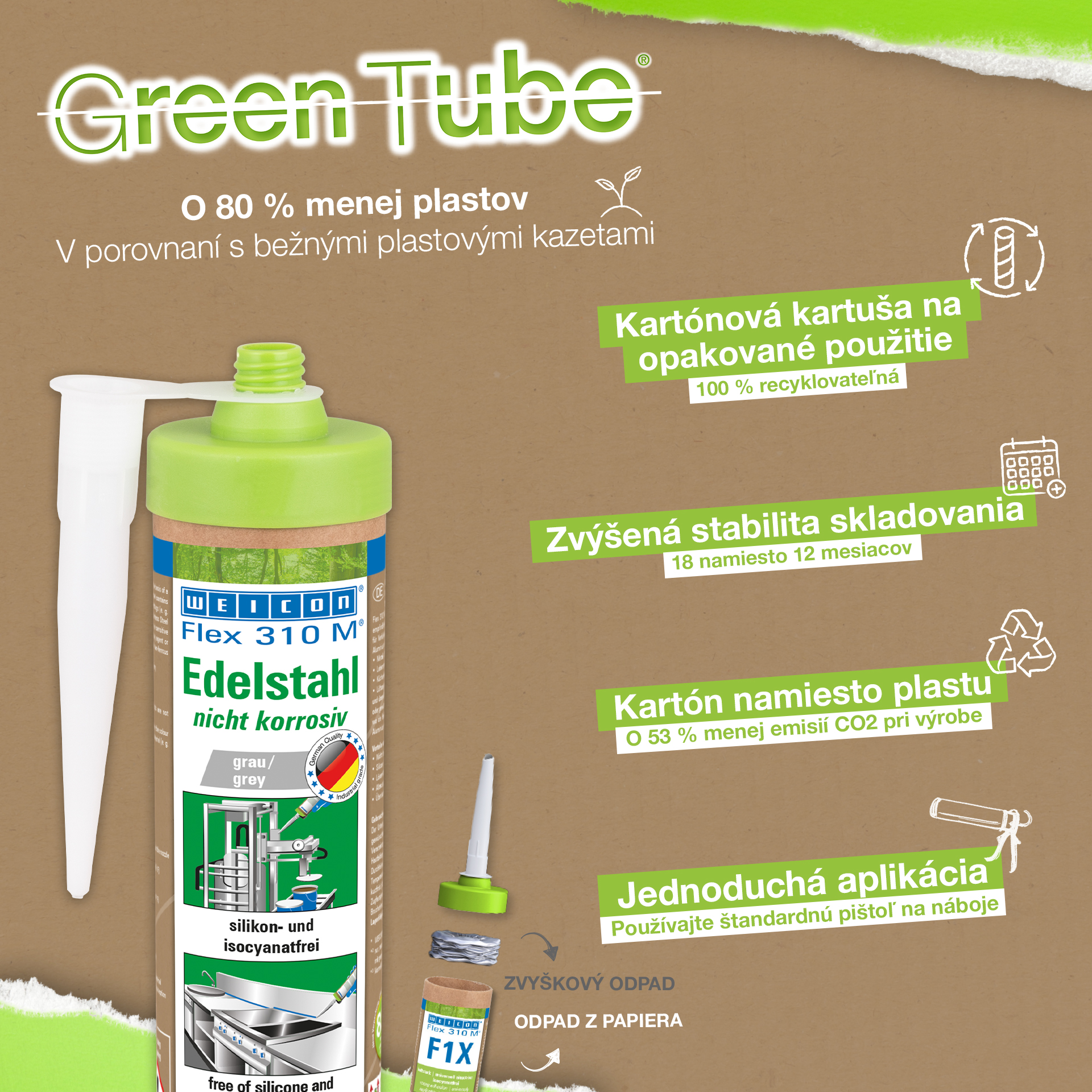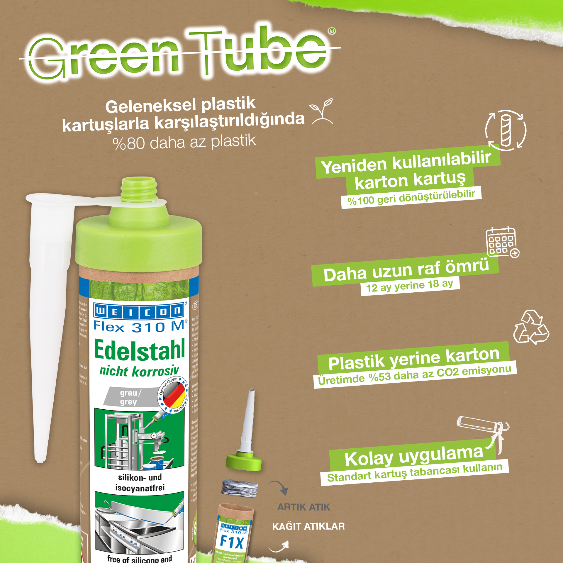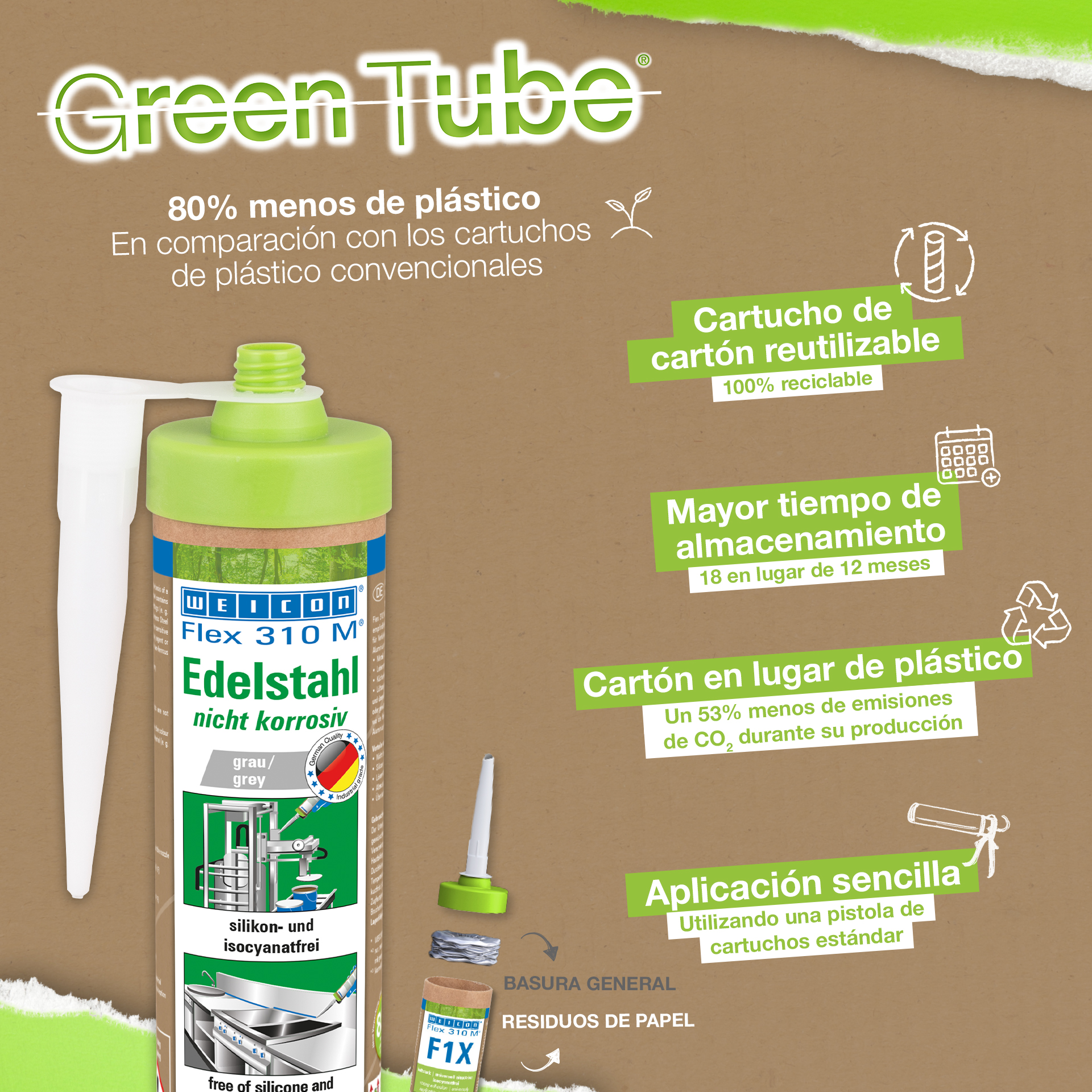 El adhesivo y sellador WEICON Flex 310 M Acero Inoxidable es anticorrosivo, pintable „húmedo en húmedo“, lijable, resistente al envejecimiento, resistente a la irradiación UV, exento de silicona, isocianato, halógenos y de diluyentes. El producto está certificado por ISEGA y puede aplicarse como adhesivo en la tecnología de alimentos. Flex 310 M Acero Inoxidable es un adhesivo elástico a base de polímero MS apto para unir y sellar costuras y junturas en metales tales como acero inoxidable, aluminio y metales no ferrosos. Se aplica además en casos en que el color del adhesivo y sellador debe adaptarse al material respectivo (por ejemplo, acero inoxidable, aluminio, etc.). WEICON Flex 310 M Acero Inoxidable puede aplicarse en construcciones metálicas, en la construcción de tanques y aparatos, en la industria de alimentos, en la construcción de cocinas, en el sector sanitario, en la técnica de ventilación y aire acondicionado y en todos los sectores en que las siliconas o productos que contienen silicona no son apropiados.