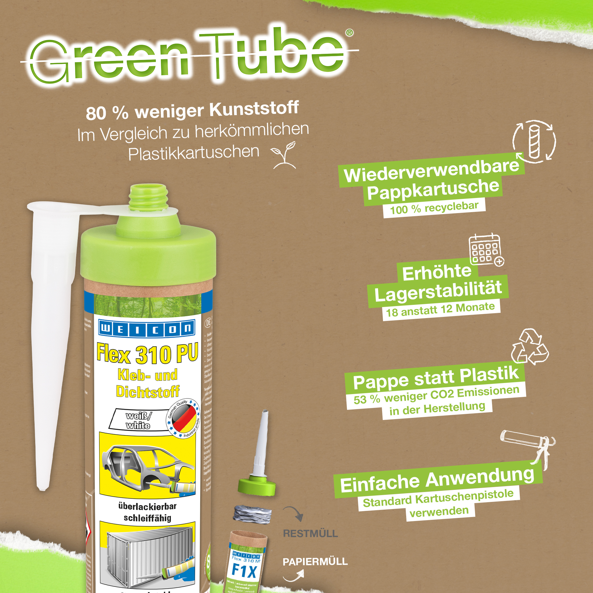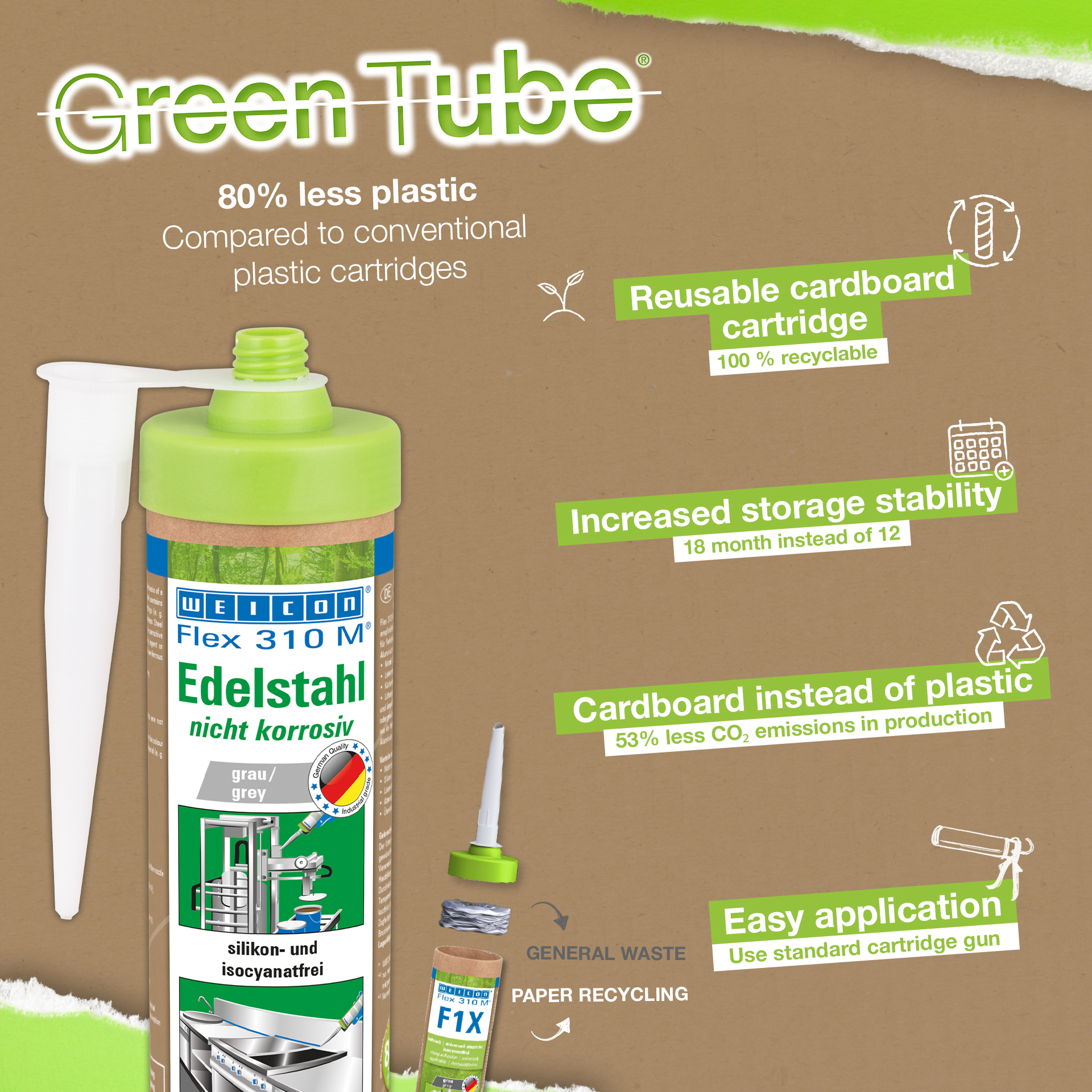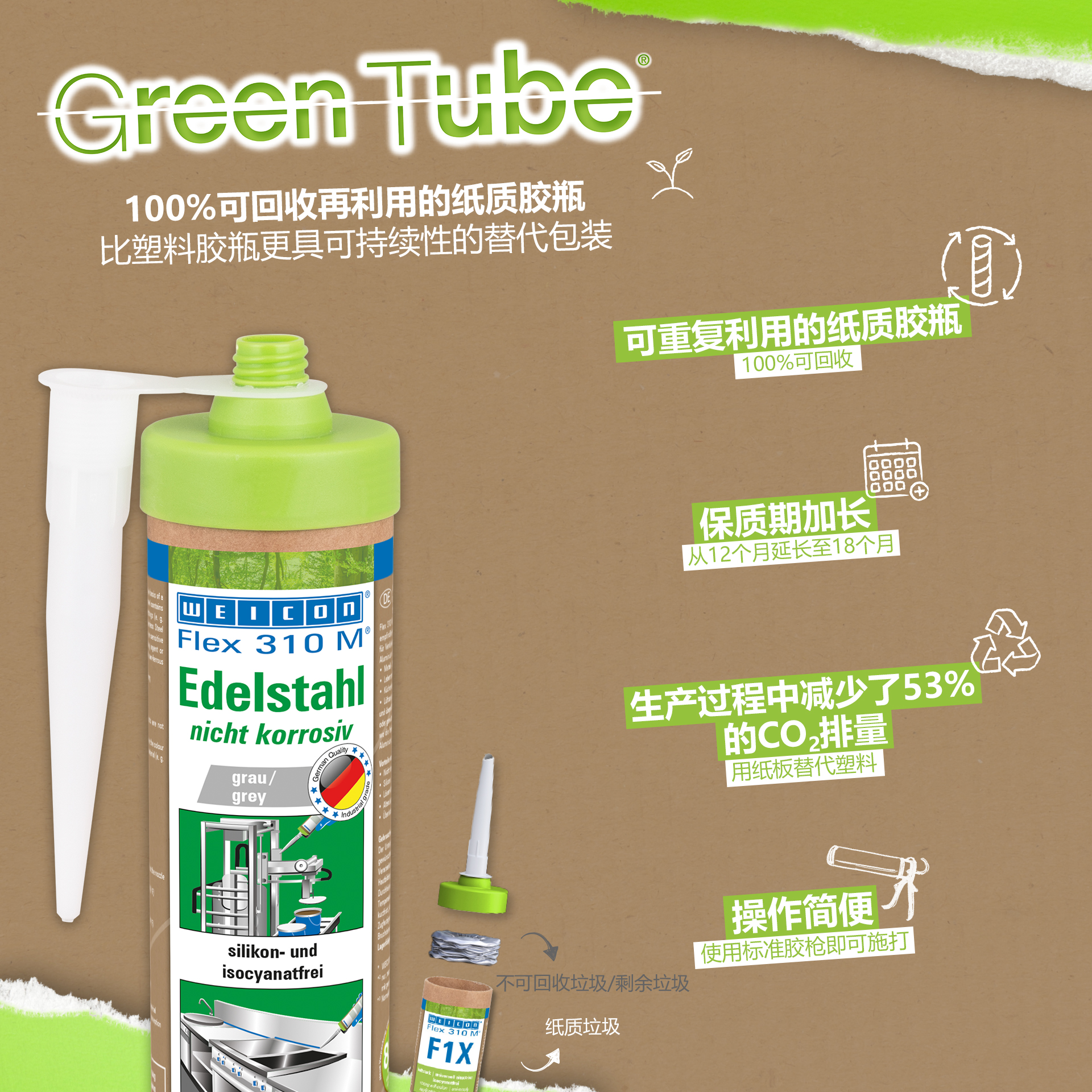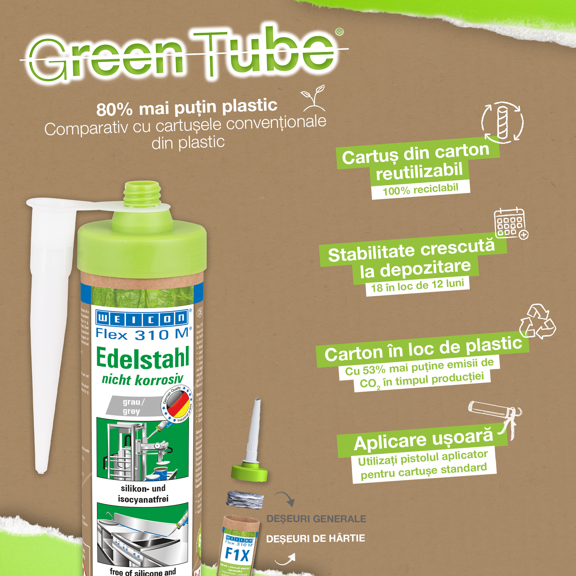 El adhesivo y sellador WEICON Flex 310 M Acero Inoxidable es anticorrosivo, pintable „húmedo en húmedo“, lijable, resistente al envejecimiento, resistente a la irradiación UV, exento de silicona, isocianato, halógenos y de diluyentes. El producto está certificado por ISEGA y puede aplicarse como adhesivo en la tecnología de alimentos. Flex 310 M Acero Inoxidable es un adhesivo elástico a base de polímero MS apto para unir y sellar costuras y junturas en metales tales como acero inoxidable, aluminio y metales no ferrosos. Se aplica además en casos en que el color del adhesivo y sellador debe adaptarse al material respectivo (por ejemplo, acero inoxidable, aluminio, etc.). WEICON Flex 310 M Acero Inoxidable puede aplicarse en construcciones metálicas, en la construcción de tanques y aparatos, en la industria de alimentos, en la construcción de cocinas, en el sector sanitario, en la técnica de ventilación y aire acondicionado y en todos los sectores en que las siliconas o productos que contienen silicona no son apropiados.