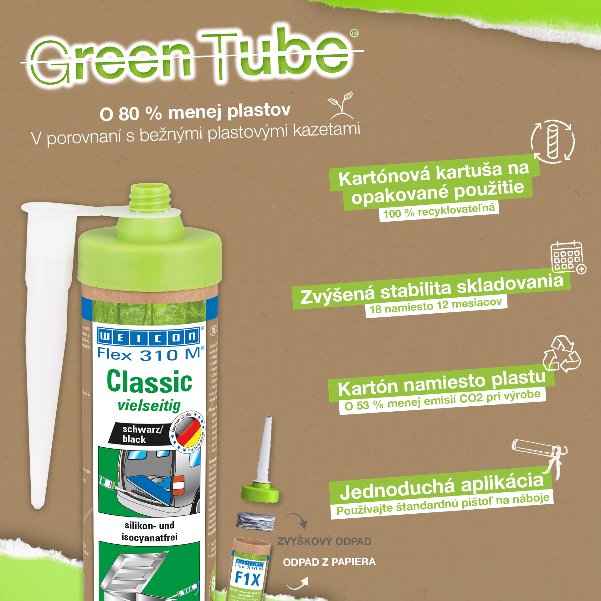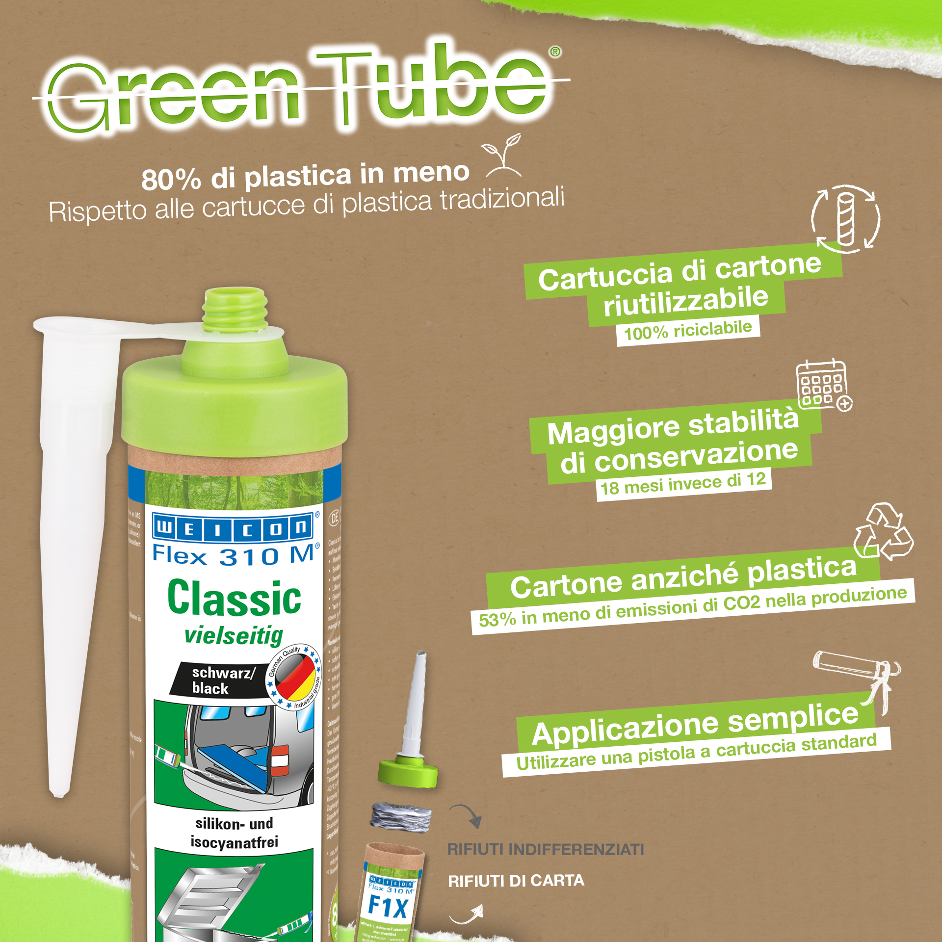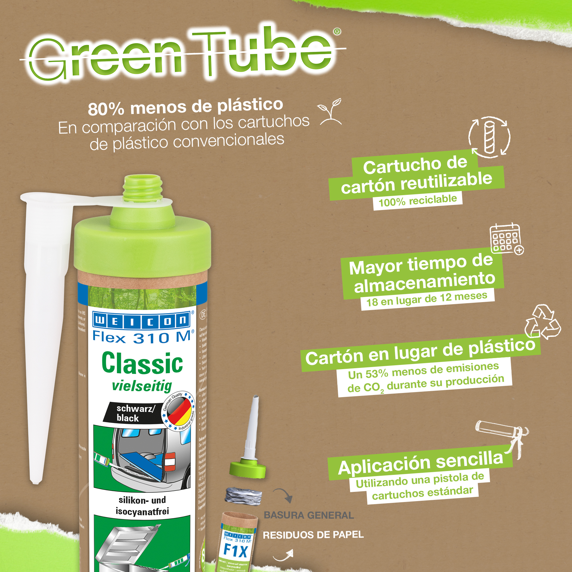 WEICON Flex 310 M Clásico ofrece una gran fuerza adherente, es pintable "húmedo sobre húmedo", es lijable, su resistencia al envejecimiento es excelente y su resistencia a la irradiación UV es buena. Es resistente al agua dulce y salada y está exento de silicona, isocianato, halógenos y de diluyentes. El producto está certificado por ISEGA y puede aplicarse como adhesivo en la tecnología de alimentos. Flex 310 M Clásico es un adhesivo elástico a base de polímero MS apto para unir metales, numerosos plásticos, cerámica, madera, vidrio y piedra. Este adhesivo y sellador puede aplicarse en construcciones metálicas, en la construcción de tanques, aparatos, carrocerías, vehículos y contenedores, en la técnica de ventilación y aire acondicionado, en la industria electrotécnica, en la construcción de yates y botes y en todos los sectores en que las siliconas o productos que contienen silicona no son apropiados.