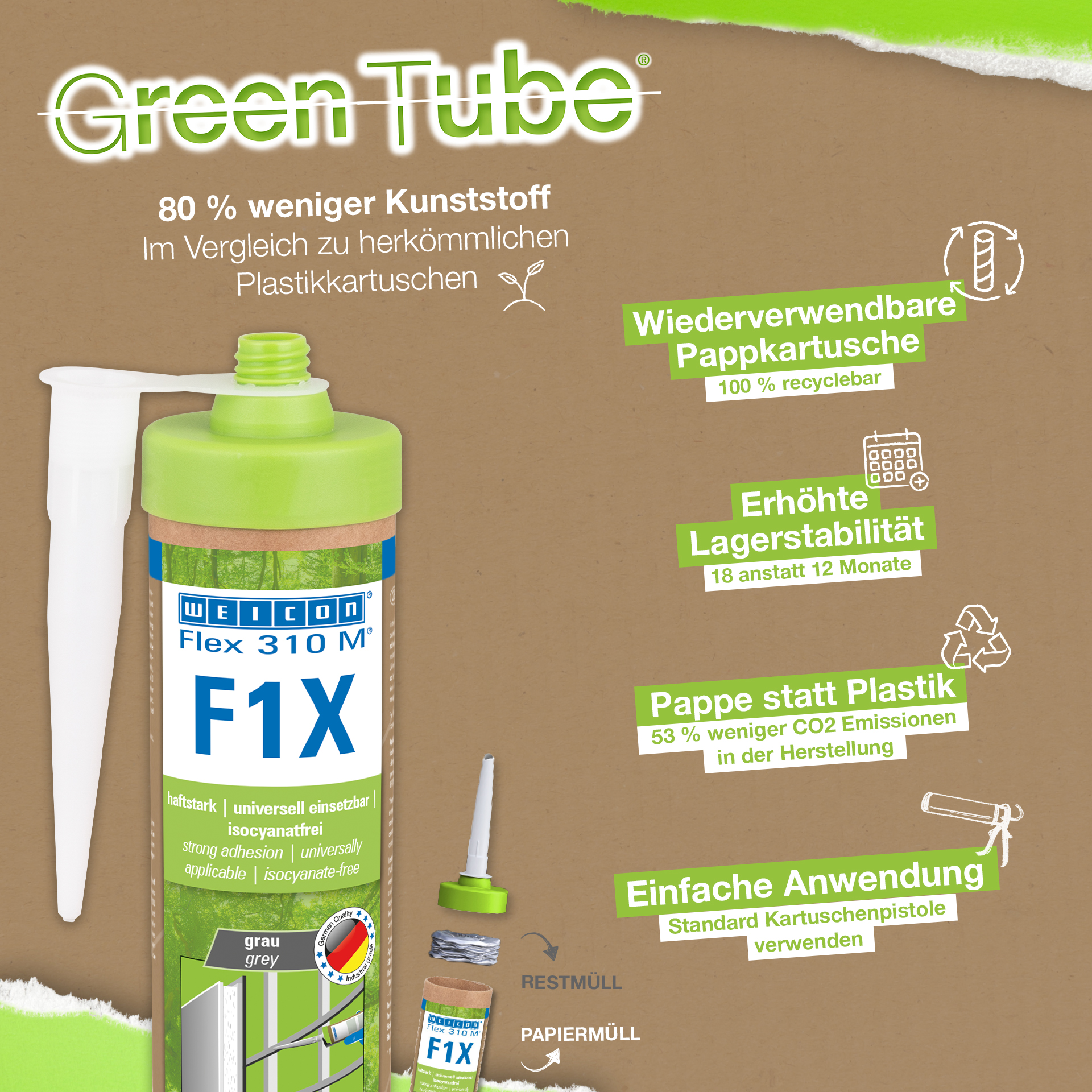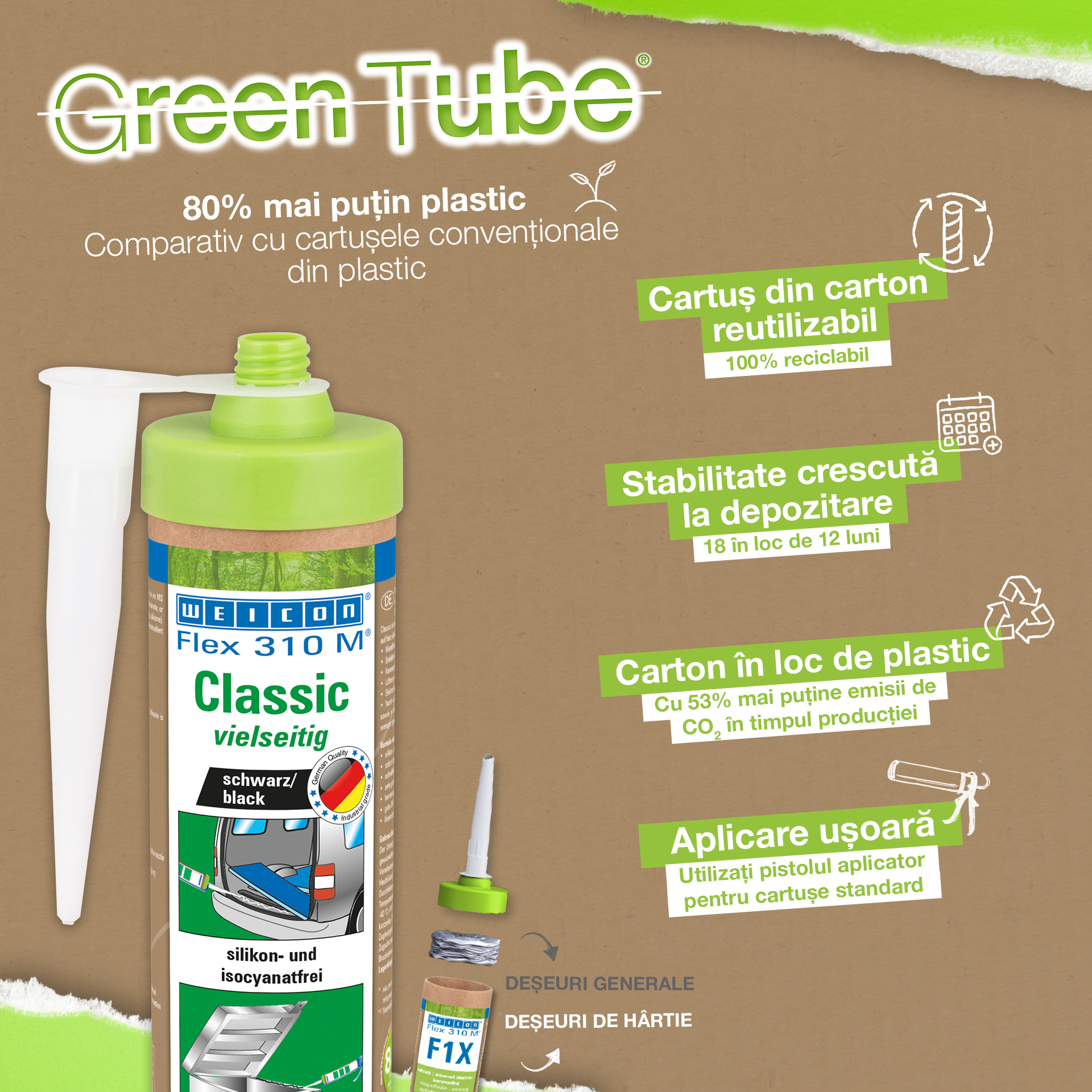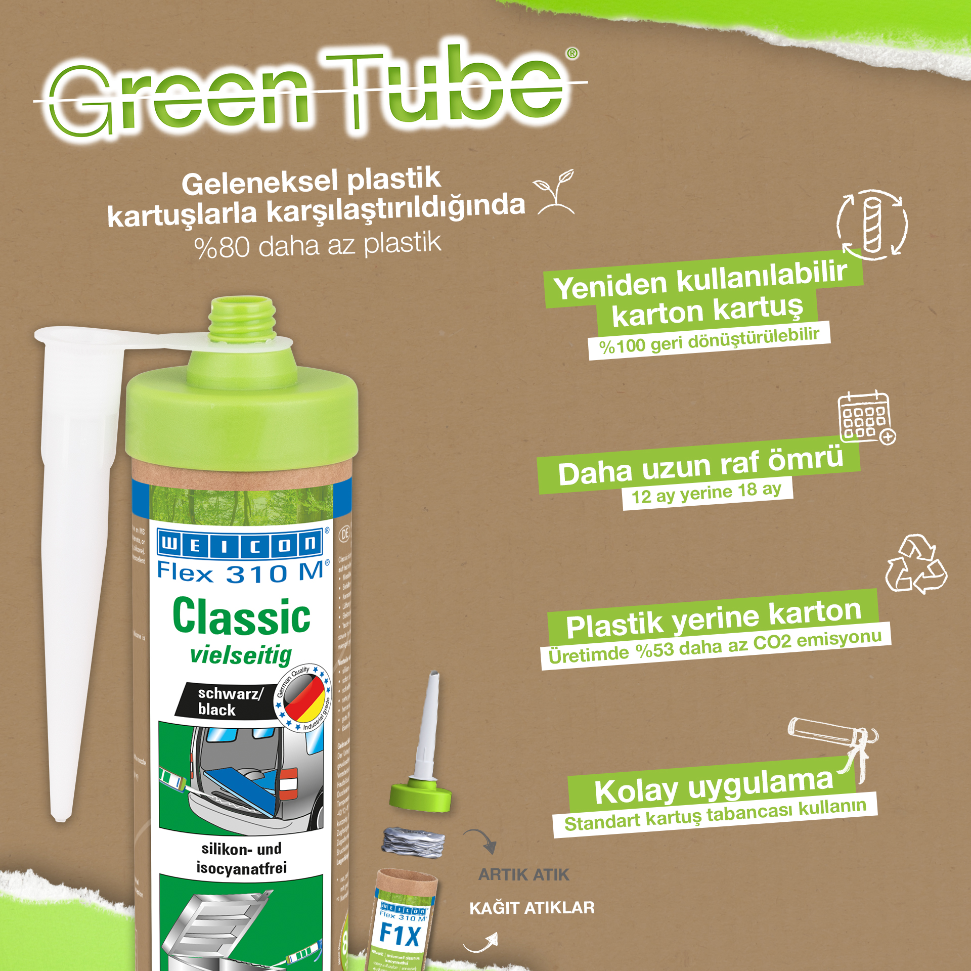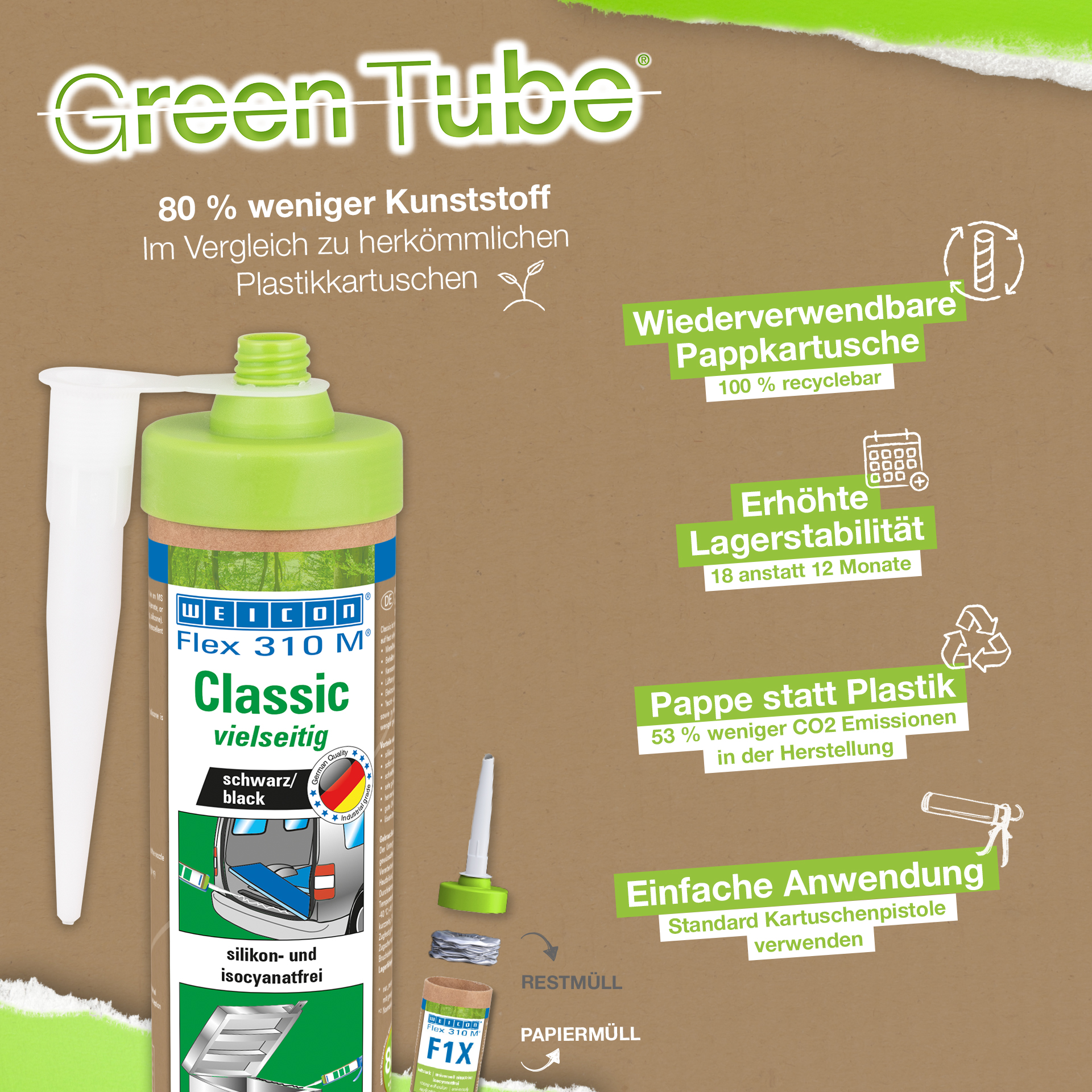 WEICON Flex 310 M Clásico ofrece una gran fuerza adherente, es pintable "húmedo sobre húmedo", es lijable, su resistencia al envejecimiento es excelente y su resistencia a la irradiación UV es buena. Es resistente al agua dulce y salada y está exento de silicona, isocianato, halógenos y de diluyentes. El producto está certificado por ISEGA y puede aplicarse como adhesivo en la tecnología de alimentos. Flex 310 M Clásico es un adhesivo elástico a base de polímero MS apto para unir metales, numerosos plásticos, cerámica, madera, vidrio y piedra. Este adhesivo y sellador puede aplicarse en construcciones metálicas, en la construcción de tanques, aparatos, carrocerías, vehículos y contenedores, en la técnica de ventilación y aire acondicionado, en la industria electrotécnica, en la construcción de yates y botes y en todos los sectores en que las siliconas o productos que contienen silicona no son apropiados.