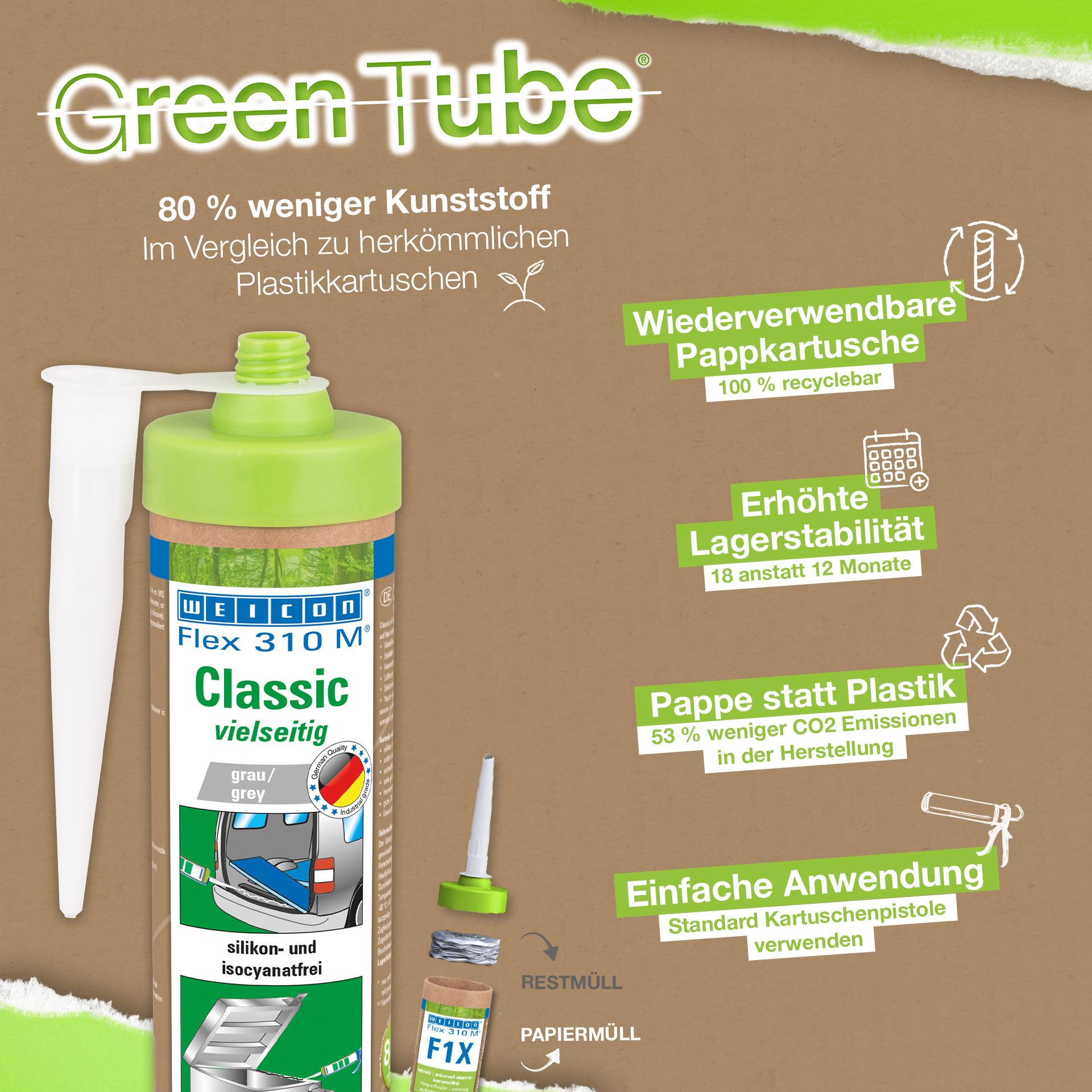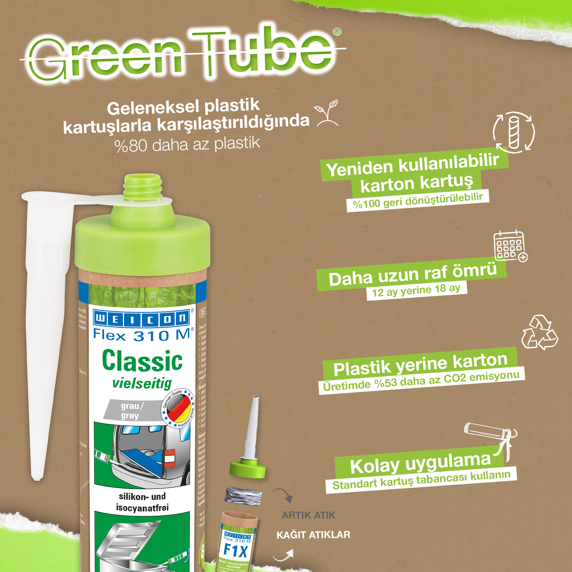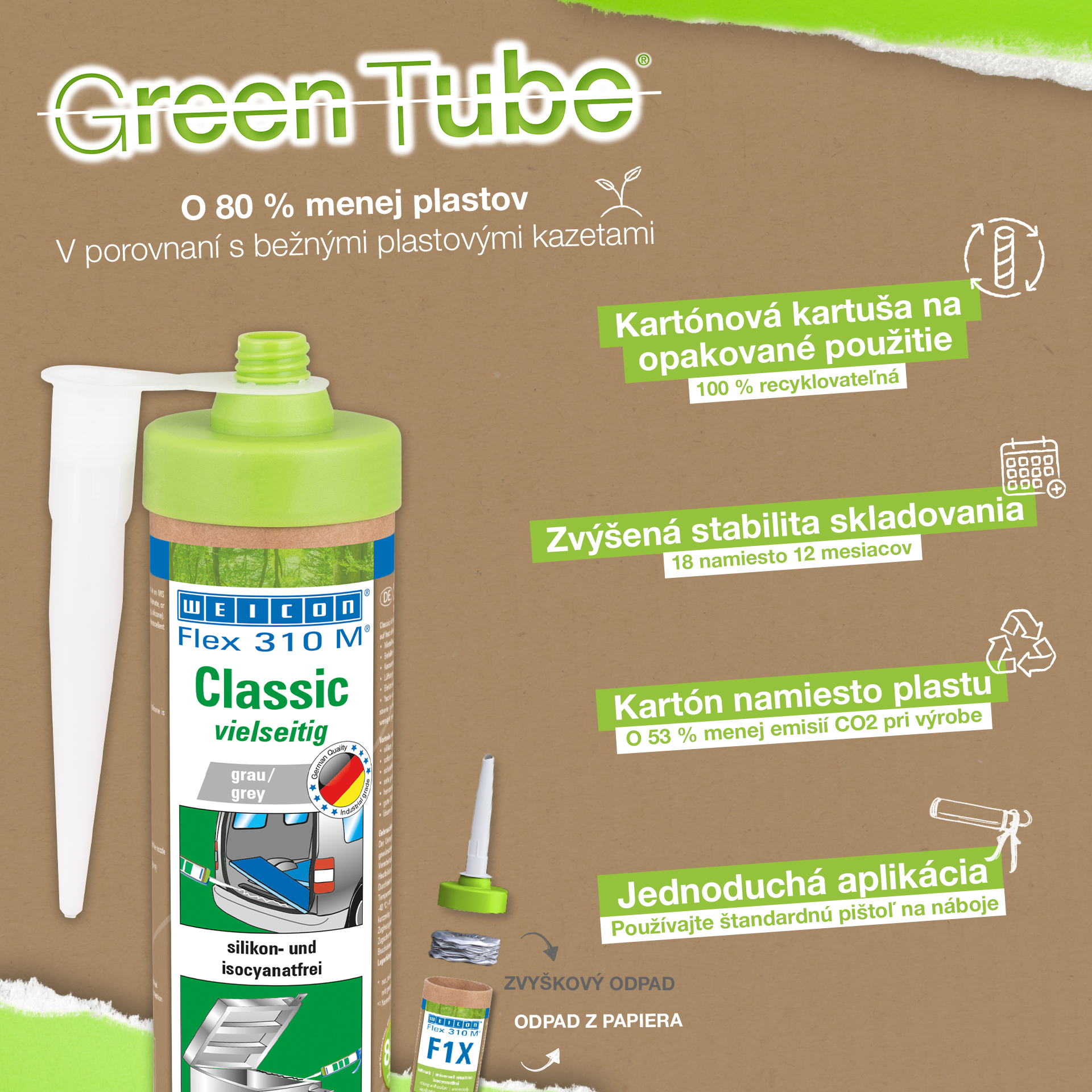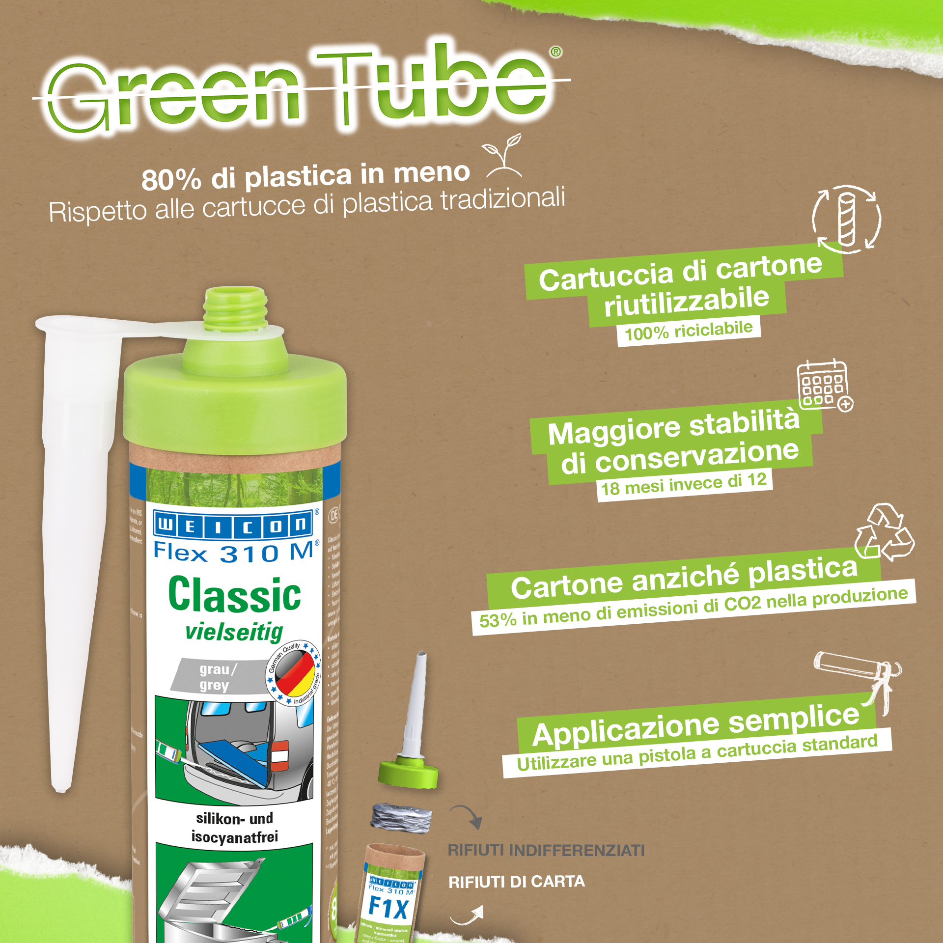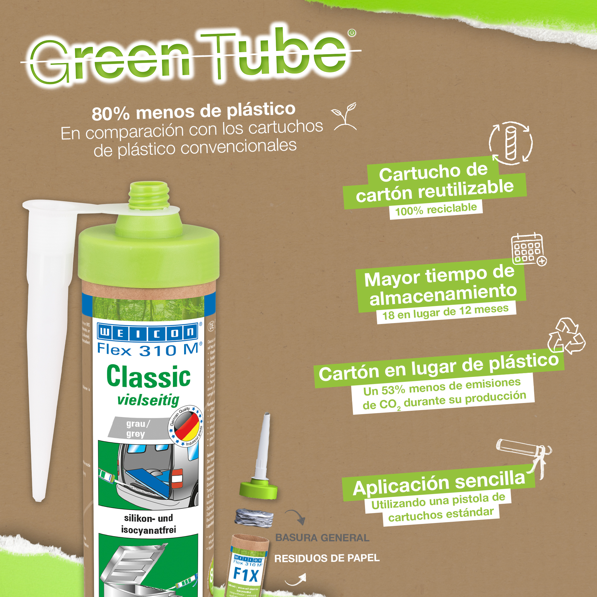 WEICON Flex 310 M Clásico ofrece una gran fuerza adherente, es pintable "húmedo sobre húmedo", es lijable, su resistencia al envejecimiento es excelente y su resistencia a la irradiación UV es buena. Es resistente al agua dulce y salada y está exento de silicona, isocianato, halógenos y de diluyentes. El producto está certificado por ISEGA y puede aplicarse como adhesivo en la tecnología de alimentos. Flex 310 M Clásico es un adhesivo elástico a base de polímero MS apto para unir metales, numerosos plásticos, cerámica, madera, vidrio y piedra. Este adhesivo y sellador puede aplicarse en construcciones metálicas, en la construcción de tanques, aparatos, carrocerías, vehículos y contenedores, en la técnica de ventilación y aire acondicionado, en la industria electrotécnica, en la construcción de yates y botes y en todos los sectores en que las siliconas o productos que contienen silicona no son apropiados.