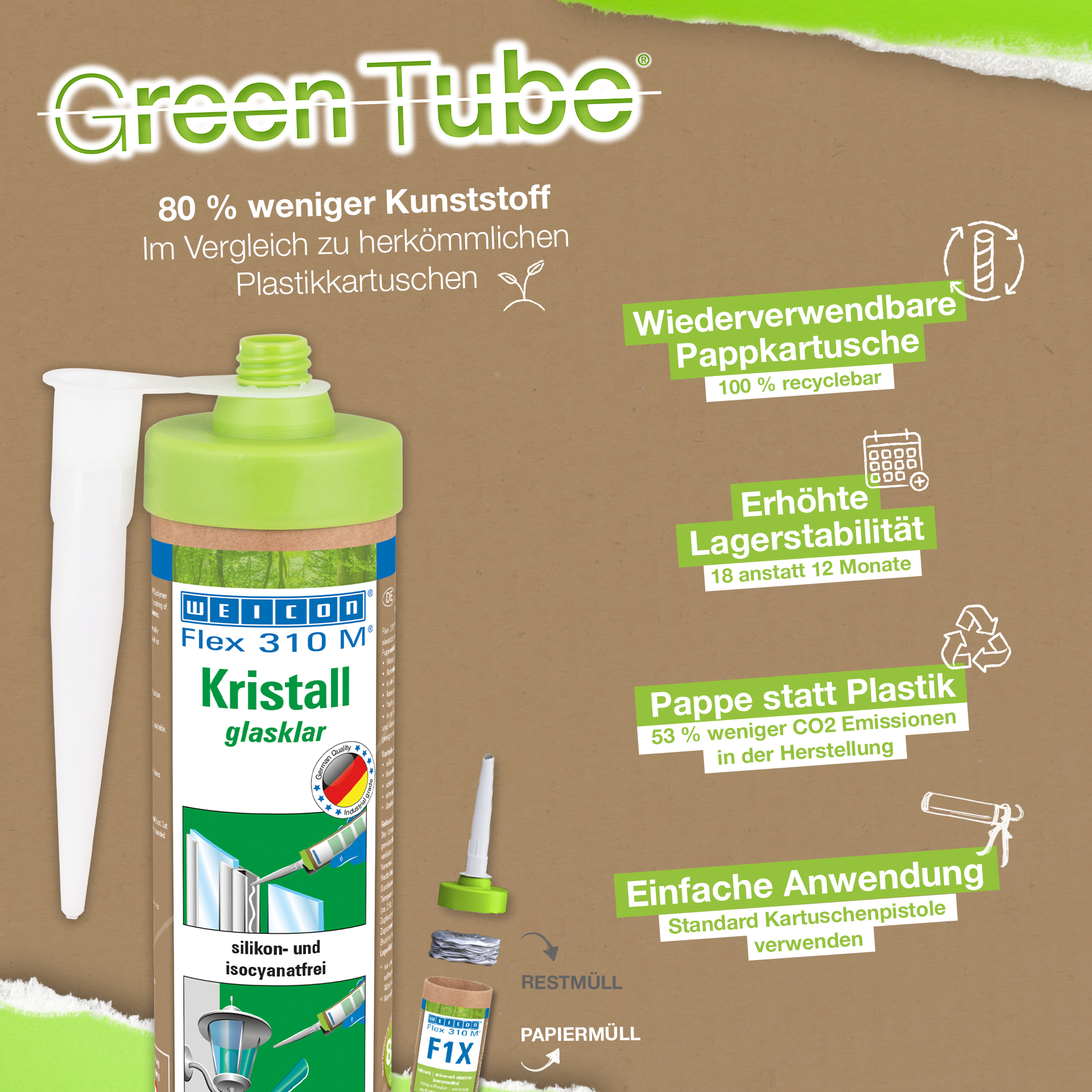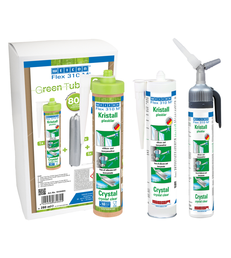 WEICON Flex 310 M Cristal es transparente, altamente adherente, pintable „húmedo sobre húmedo“, lijable y tiene excelente resistencia al envejecimiento, una buena resistencia a la irradiación UV así como buena resistencia al agua dulce y salada. Es exento de silicona, isocianato, halógenos y diluyentes. Está certificado por ISEGA y puede aplicarse como adhesivo en la tecnología de alimentos. Flex 310 M Cristal es un adhesivo elástico a base de polímero MS adecuado para unir vidrio, PC*, PMMA* vidrio acrílico*, metales, numerosos plásticos, cerámica, madera y piedra. El producto es transparente después del endurecimiento y es apto especialmente para uniones elásticas en las cuales el adhesivo puede o debe ser invisible. Para aplicaciones en el procesamiento de plásticos, en construcciones metálicas, en la construcción de tanques, aparatos, en la técnica de ventilación y aire acondicionado, en la industria electrotécnica y de iluminación, en la construcción de recintos feriales y almacenes y en todos los sectores en que las siliconas o productos que contienen silicona no son apropiados. (* = unir solamente sin tensiones)