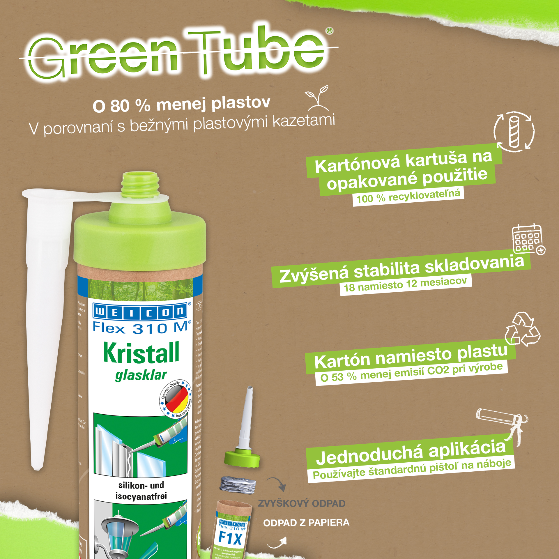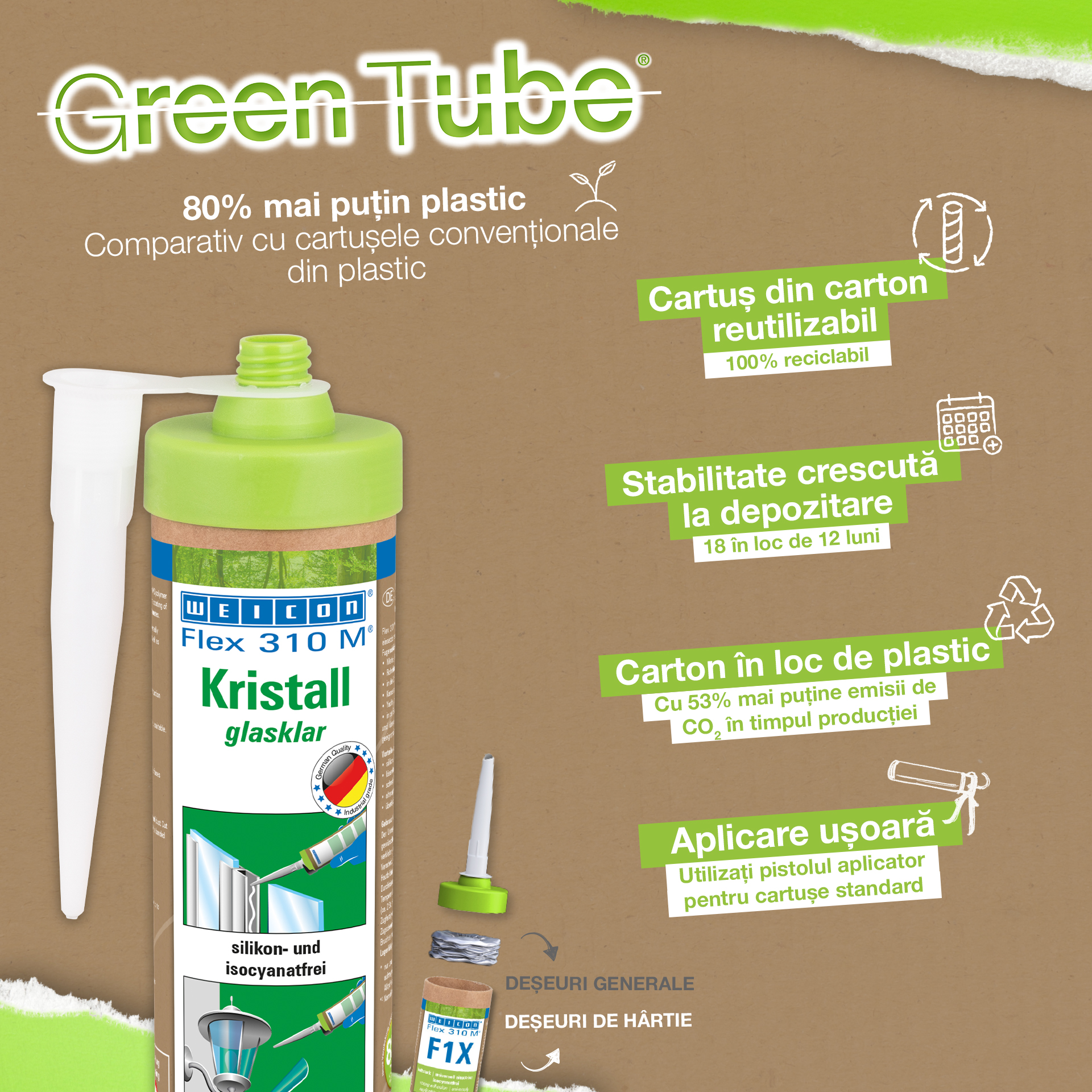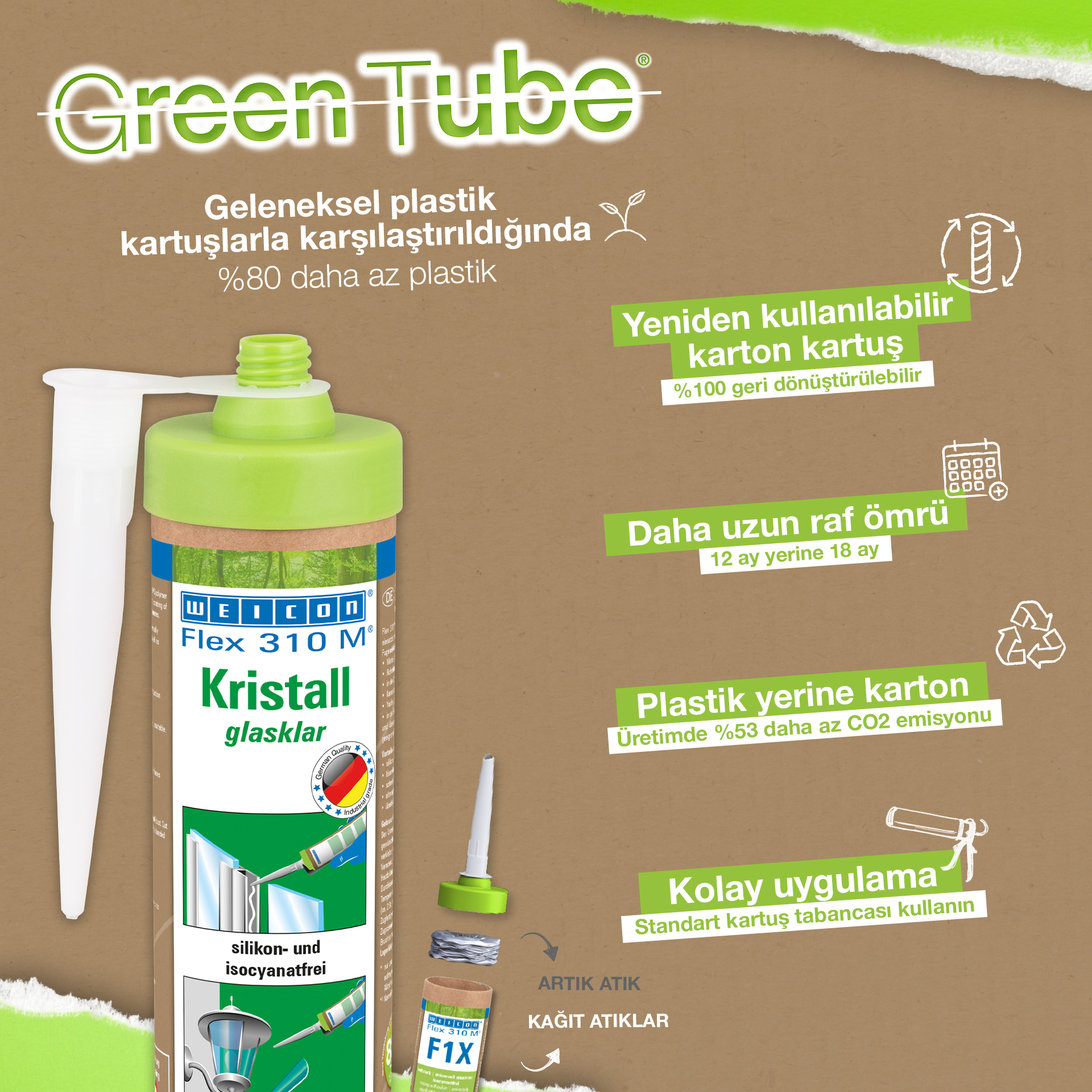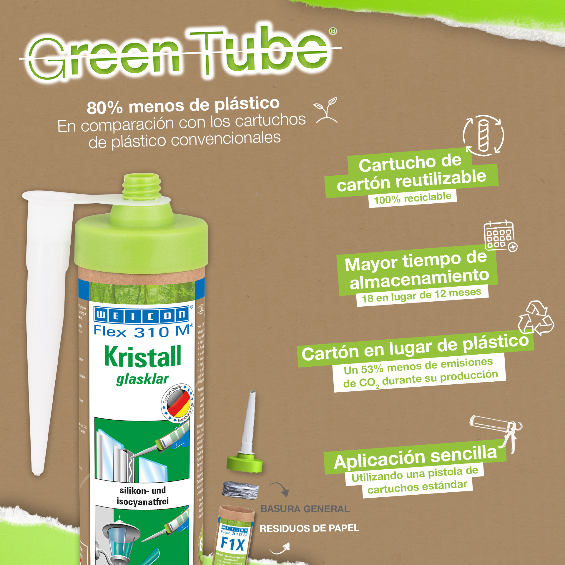 WEICON Flex 310 M Cristal es transparente, altamente adherente, pintable „húmedo sobre húmedo“, lijable y tiene excelente resistencia al envejecimiento, una buena resistencia a la irradiación UV así como buena resistencia al agua dulce y salada. Es exento de silicona, isocianato, halógenos y diluyentes. Está certificado por ISEGA y puede aplicarse como adhesivo en la tecnología de alimentos. Flex 310 M Cristal es un adhesivo elástico a base de polímero MS adecuado para unir vidrio, PC*, PMMA* vidrio acrílico*, metales, numerosos plásticos, cerámica, madera y piedra. El producto es transparente después del endurecimiento y es apto especialmente para uniones elásticas en las cuales el adhesivo puede o debe ser invisible. Para aplicaciones en el procesamiento de plásticos, en construcciones metálicas, en la construcción de tanques, aparatos, en la técnica de ventilación y aire acondicionado, en la industria electrotécnica y de iluminación, en la construcción de recintos feriales y almacenes y en todos los sectores en que las siliconas o productos que contienen silicona no son apropiados. (* = unir solamente sin tensiones)