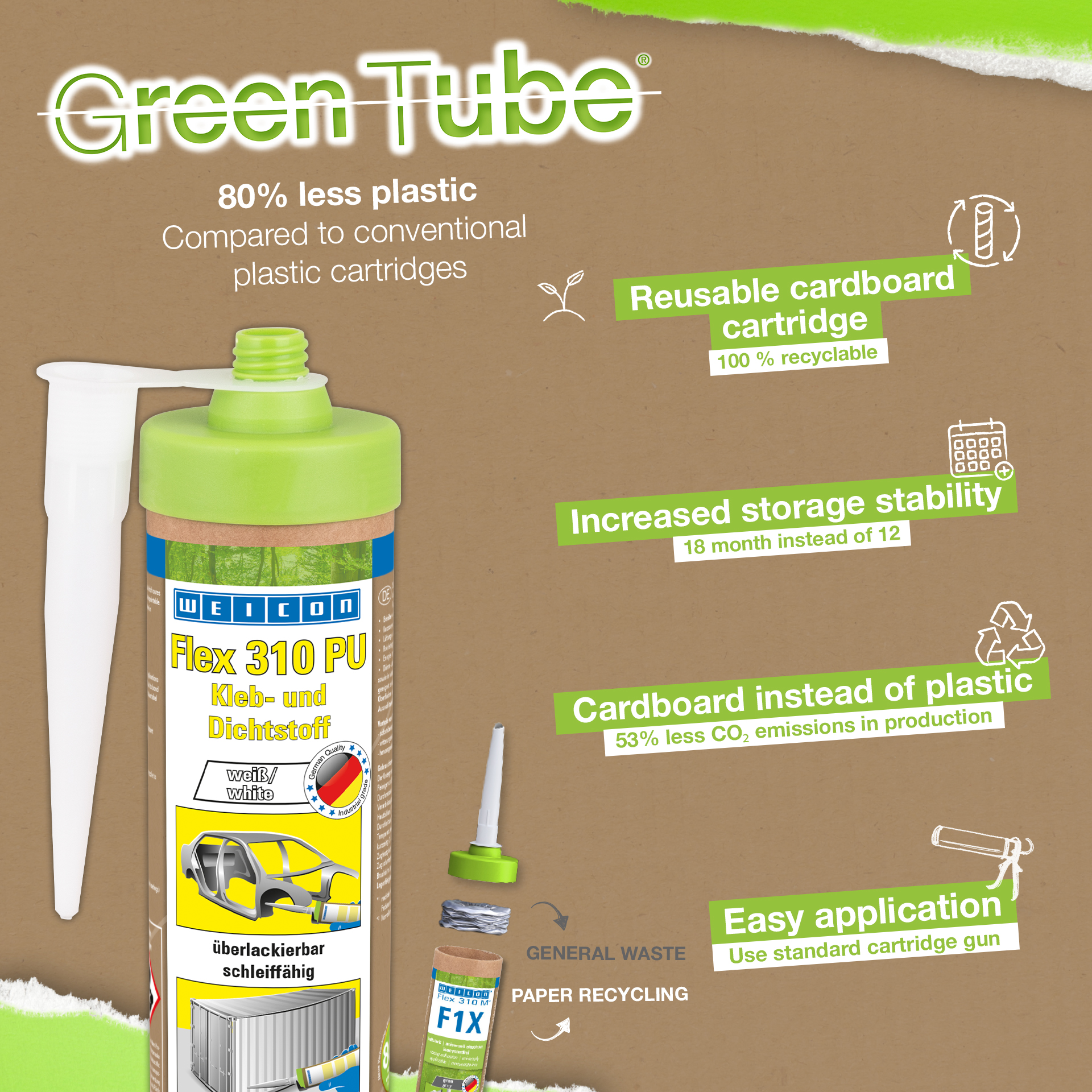 Flex 310 PU es de elasticidad permanente, alta fuerza adhesiva, pintable, resistente a la intemperie, a la irradiación UV, al agua dulce y salada y está exento de silicona. Este producto es un adhesivo y sellador elástico a base de poliuretano (PUR) aplicado para uniones y sellados en numerosos materiales, tales como metales, plásticos, cerámica, madera, vidrio y piedra. Para aplicaciones en la construcción de tanques, aparatos, carrocerías, vehículos y contenedores, en la técnica de ventilación y aire acondicionado, en la técnica de materiales sintéticos, en la industria energética y electrotécnica y en todos los sectores en que las siliconas o productos que contienen silicona no son apropiados.