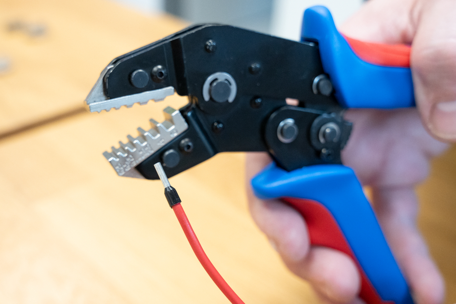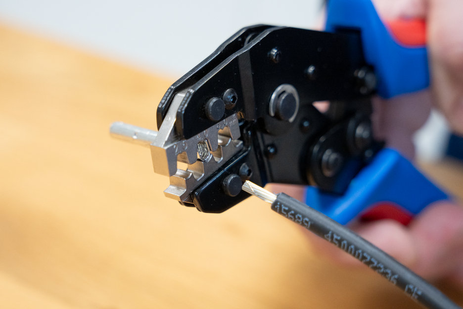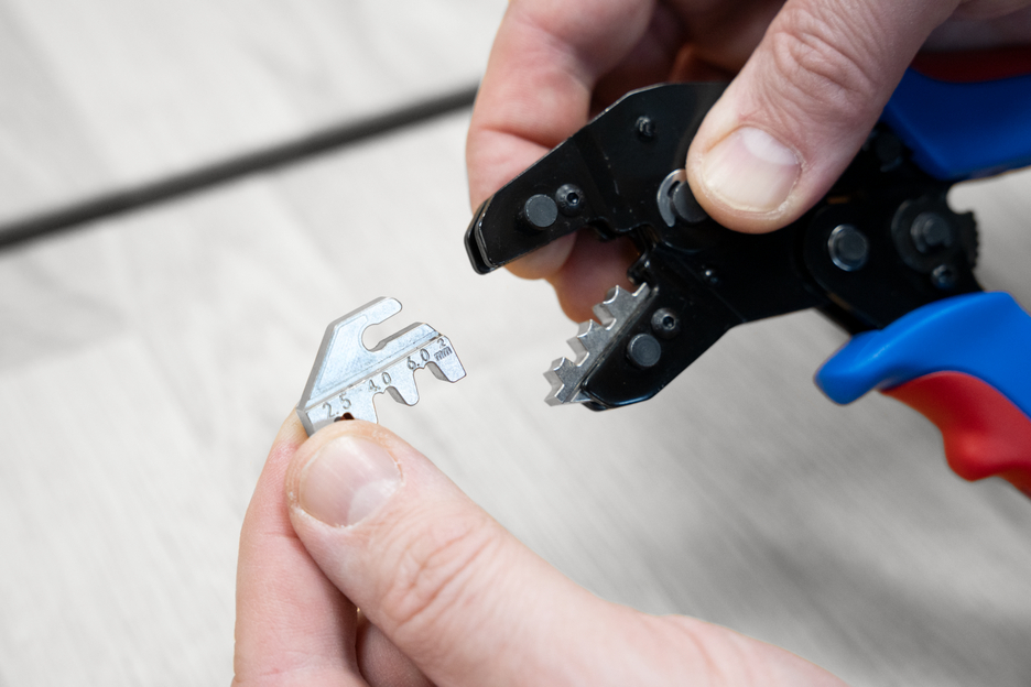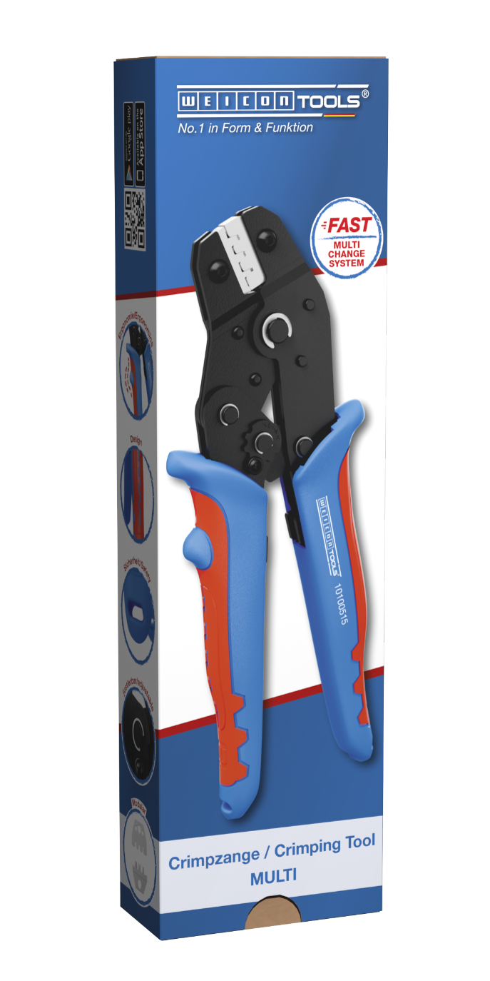 MULTI-CRIMP was developed for the process-safe crimping of various electrical connectors. The crimping tool has a ratchet mechanism with a blocking device to ensure a consistently high crimping quality and results that can be precisely repeated. The mechanism only opens the tool when the crimping process is complete. An emergency release has also been integrated into the handle, which opens the crimping tool in the event of misuse. The accurate eccentric setting ensures a high crimping quality thanks to the precisely adjustable crimping force. With the Multi Change System, the module pairs of the crimping tool can be exchanged quickly and easily, as needed. The change system, which requires no additional tools, ensures that the modules can be installed and removed fast. The standard version of the crimping tool is equipped with three pairs of modules made of high-quality steel. One pair for MC4 connectors with cable cross-sections of 2.5 mm², 4 mm² and 6 mm² (14-10 AWG). Another pair of modules for insulated wire end ferrules from 0.25-6 mm² (AWG 24-10) and a third module for insulated cable lugs from 0.25-2.5 mm² (AWG 24-14). The three pairs of modules are stored safely and protected from dust in a small plastic box. The 2-component handles of the MULTI-CRIMP tool ensure non-slip and ergonomically friendly handling with maximum force transmission. The tried and tested “ice-crack design” was used, which ensures a comfortable feel. The integrated eyelets on the handles can be used to attach a safety catch.