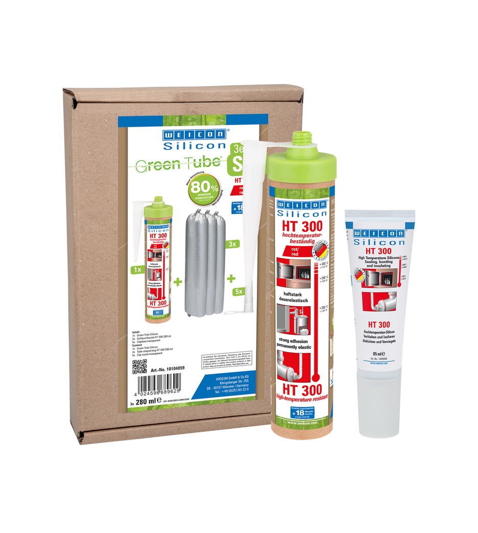 WEICON HT 300 es resistente a altas temperaturas (+300 °C/+572 °F), exento de diluyentes, de gran adherencia, con reticulante de acetato, resistente a la intemperie, al envejecimiento y a productos químicos y extremamente elástico (alargamiento a la rotura de aprox. 300%). El producto es apto especialmente para uniones y sellados sometidos a gran calor y ofrece una excelente adherencia al acero, aluminio, vidrio, cerámica y a numerosos otros materiales. Este adhesivo y sellador puede aplicarse en hornos industriales, en instalaciones de gas de humo, instalaciones de calefacción, conductos de gases de escape, armarios térmicos y en una gran cantidad de otros campos.