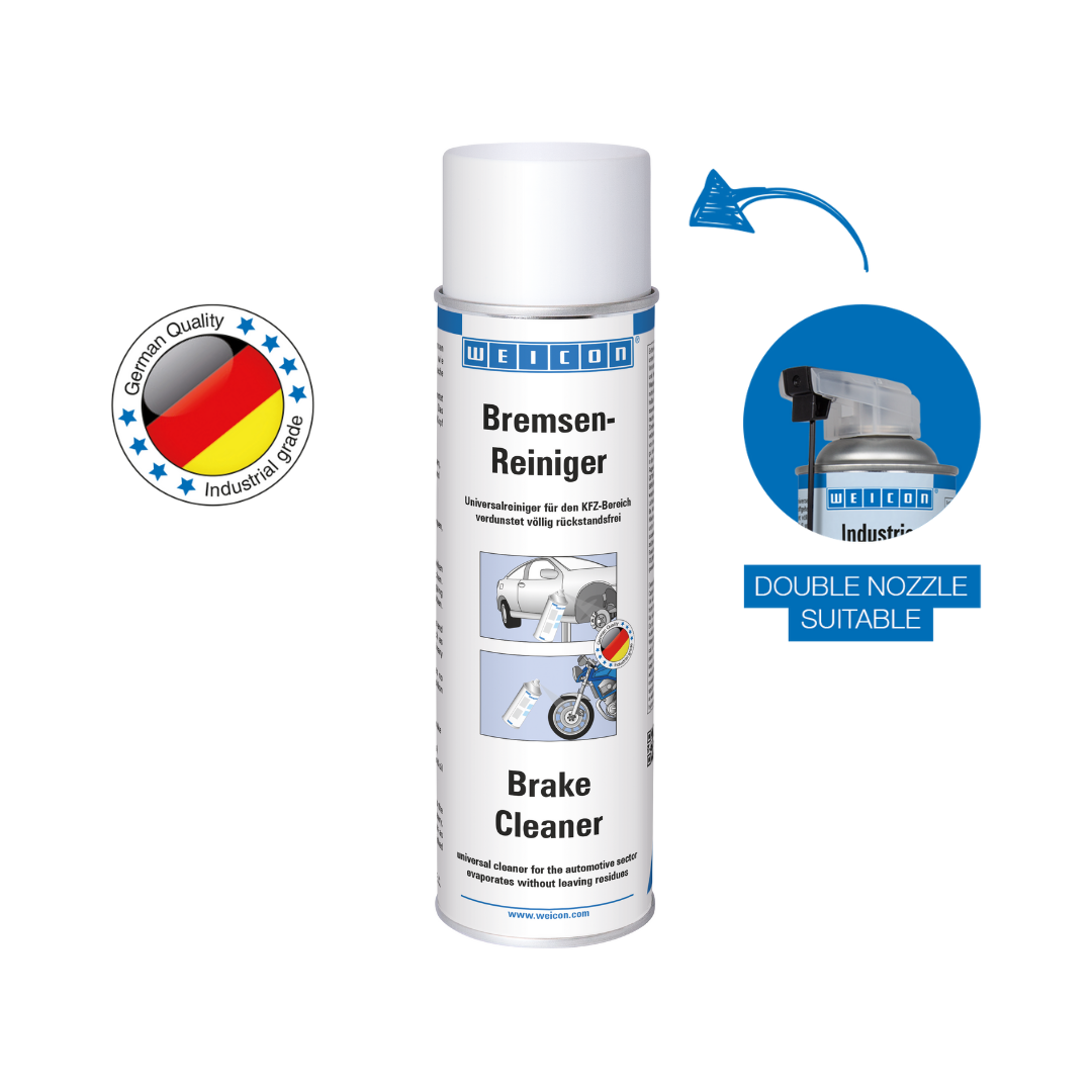 El Limpiador de Frenos es un limpiador universal para el sector automovilístico. Limpia y desengrasa sin dejar residuo alguno después de evaporarse. El Limpiador de Frenos WEICON desengrasa y limpia rápida y fácilmente metales, vidrio y numerosos plásticos y elimina toda la suciedad aceitosa o grasosa sin dejar residuos. El Limpiador de Frenos WEICON puede aplicarse en los frenos (frenos de tambor y de disco, guarniciones, zapatas de freno, cilindros, resortes y bujes), en embragues (guarniciones y piezas de embragues) o en piezas del motor (carburadores, bombas de gasolina y aceite, transmisiones, etc.).