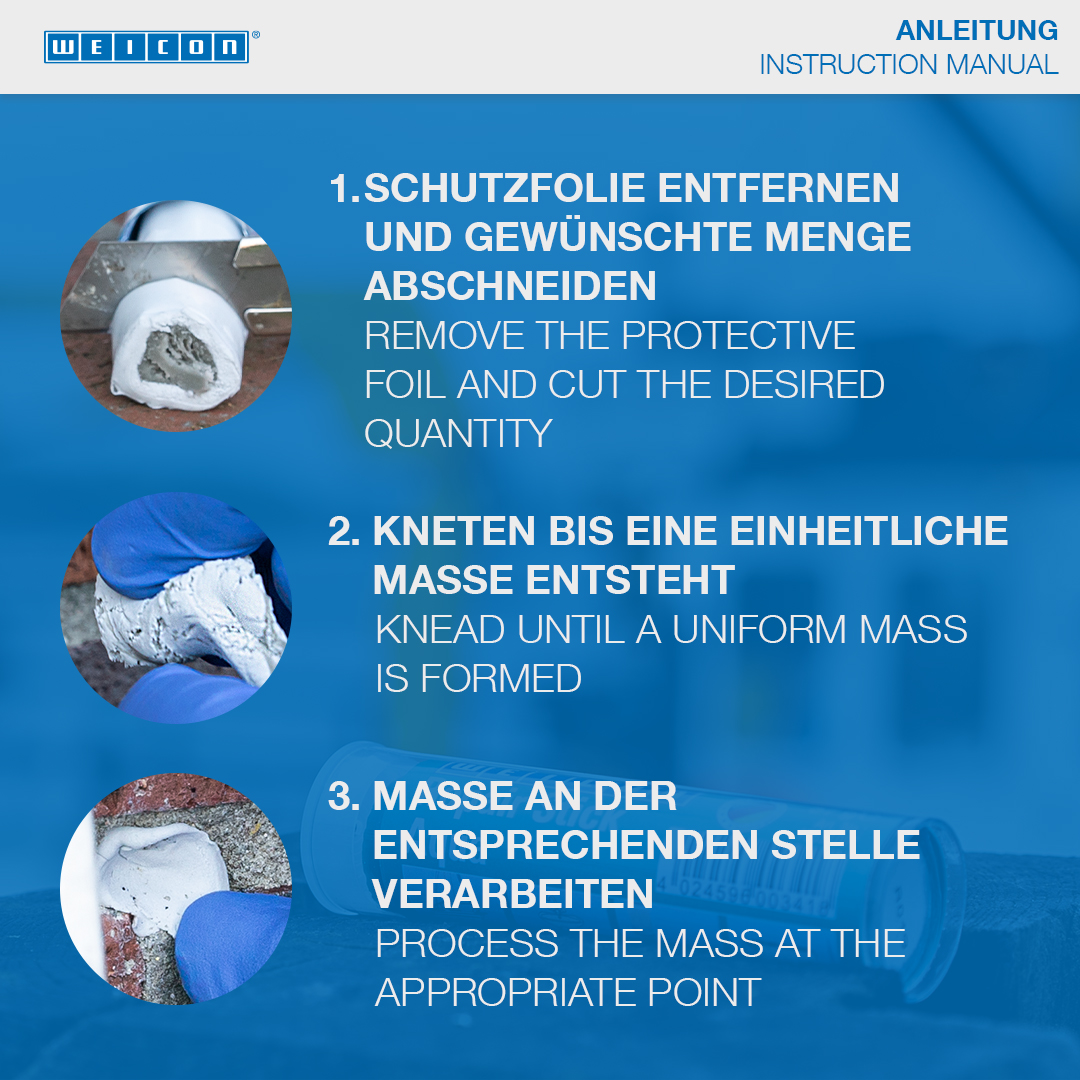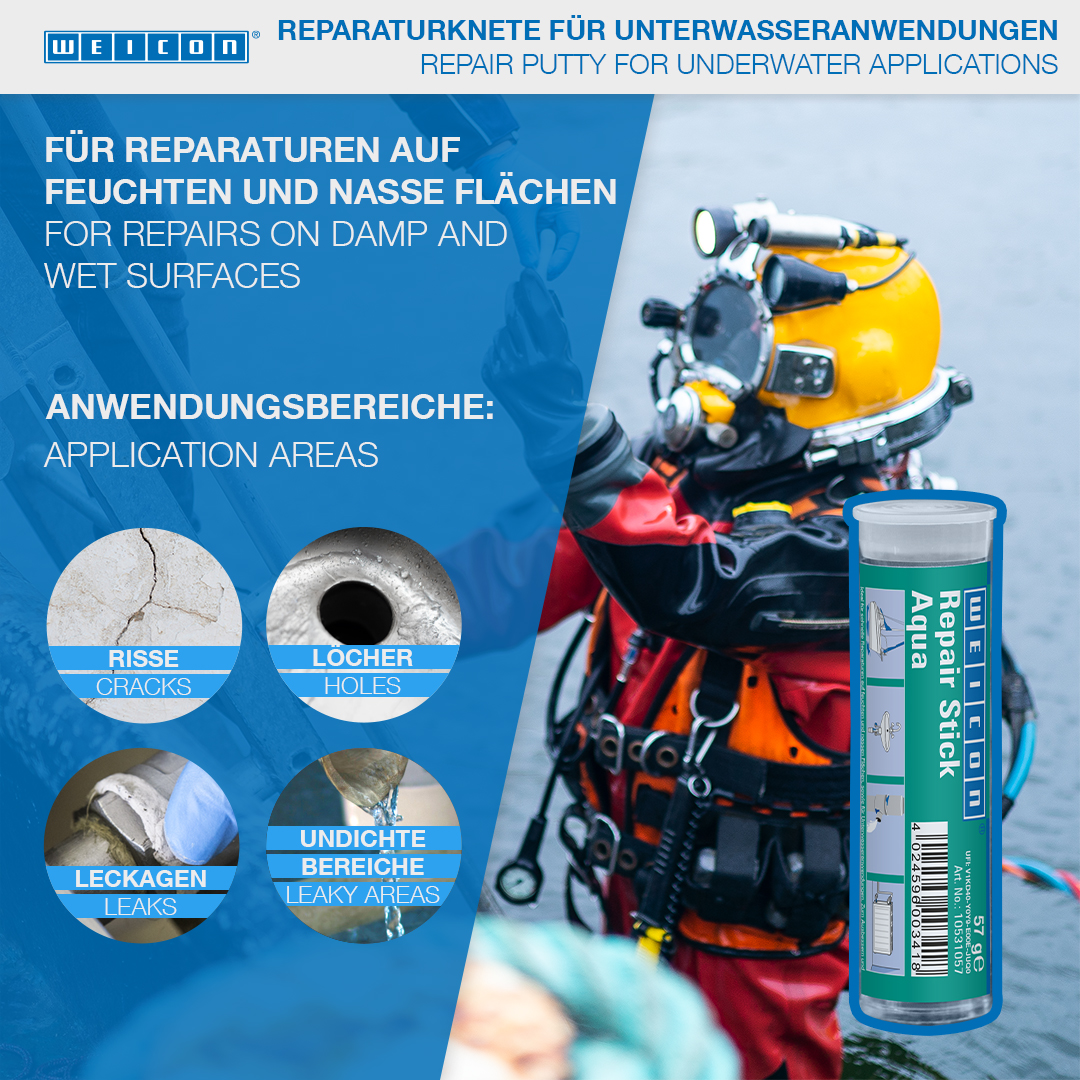 Ideal para reparaciones rápidas en superficies húmedas y mojadas así como para aplicaciones bajo agua. Para reparar y sellar grietas, orificios, escapes y fugas en tanques de gasolina y de agua, en radiadores de calefacción, sistemas electrotécnicos de distribución, instalaciones sanitarias y en piscinas. La Masilla Reparadora Aqua puede aplicarse en la construcción de sistemas sanitarios y de calefacción, en el sector electrotécnico y marítimo y en una gran cantidad de otros campos industriales.