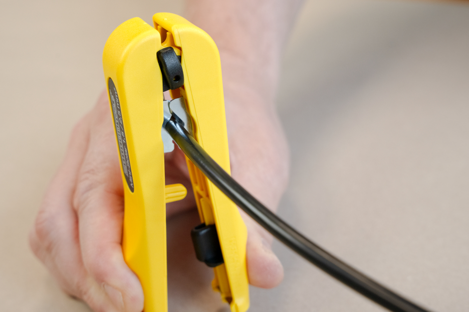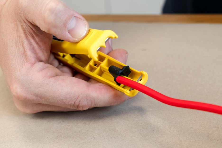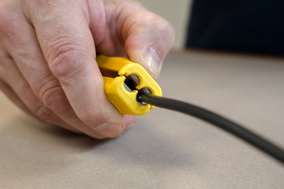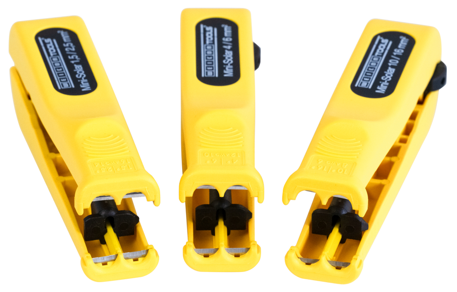Con el pelacables Mini-Solar 10/16 mm² se pueden pelar todos los cables solares habituales de forma rápida y sencilla. No es necesario ajustar manualmente la profundidad de corte. El tope de longitud integrado (de 6 a 28 mm) es adecuado para pelar cables solares de 10 ó 16 mm². Además, la herramienta reforzada con fibra de vidrio dispone de un cortador lateral de fácil acceso para cables de hasta 10 mm². Al utilizar el pelacables, se crea un patrón de corte preciso durante el pelado. Además, la Mini-Solar 10/16 mm² se puede bloquear para ahorrar espacio.