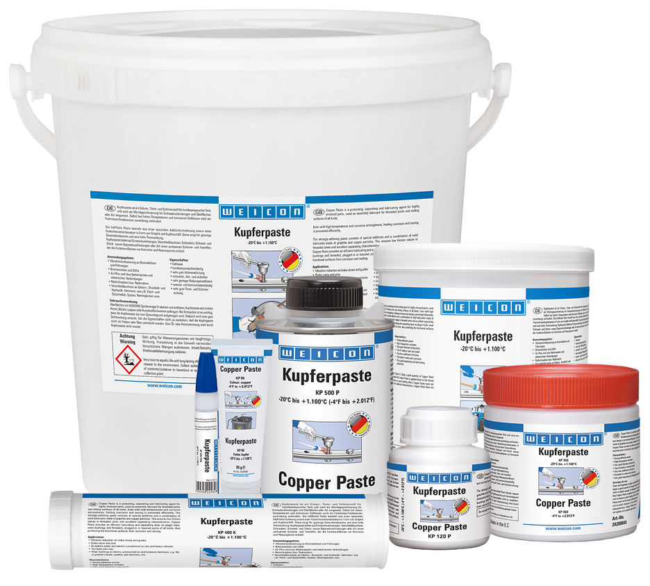 WEICON Pasta de Cobre es un material protector, antiadherente y lubricante resistente a altas temperaturas y a la corrosión, de gran fuerza adherente, exenta de plomo y de níquel. Pasta de Cobre se aplica como lubricante de montaje de uniones atornilladas y en superficies de deslizamiento de todo tipo. En herramientas encajables, bujes de desgaste, tornillos, uniones roscadas y de bayoneta de todo tipo, forma una efectiva película lubricante separadora que protege las superficies de trabajo contra corrosión y agarrotamiento. Puede aplicarse para reducir la vibración en zapatas de freno y guías, levas de freno y pasadores, en los polos de baterías de automóviles y camiones así como en otras uniones eléctricas, en pernos y tuercas de las ruedas y en bujes de desgaste de martillos eléctricos, neumáticos e hidráulicos.
