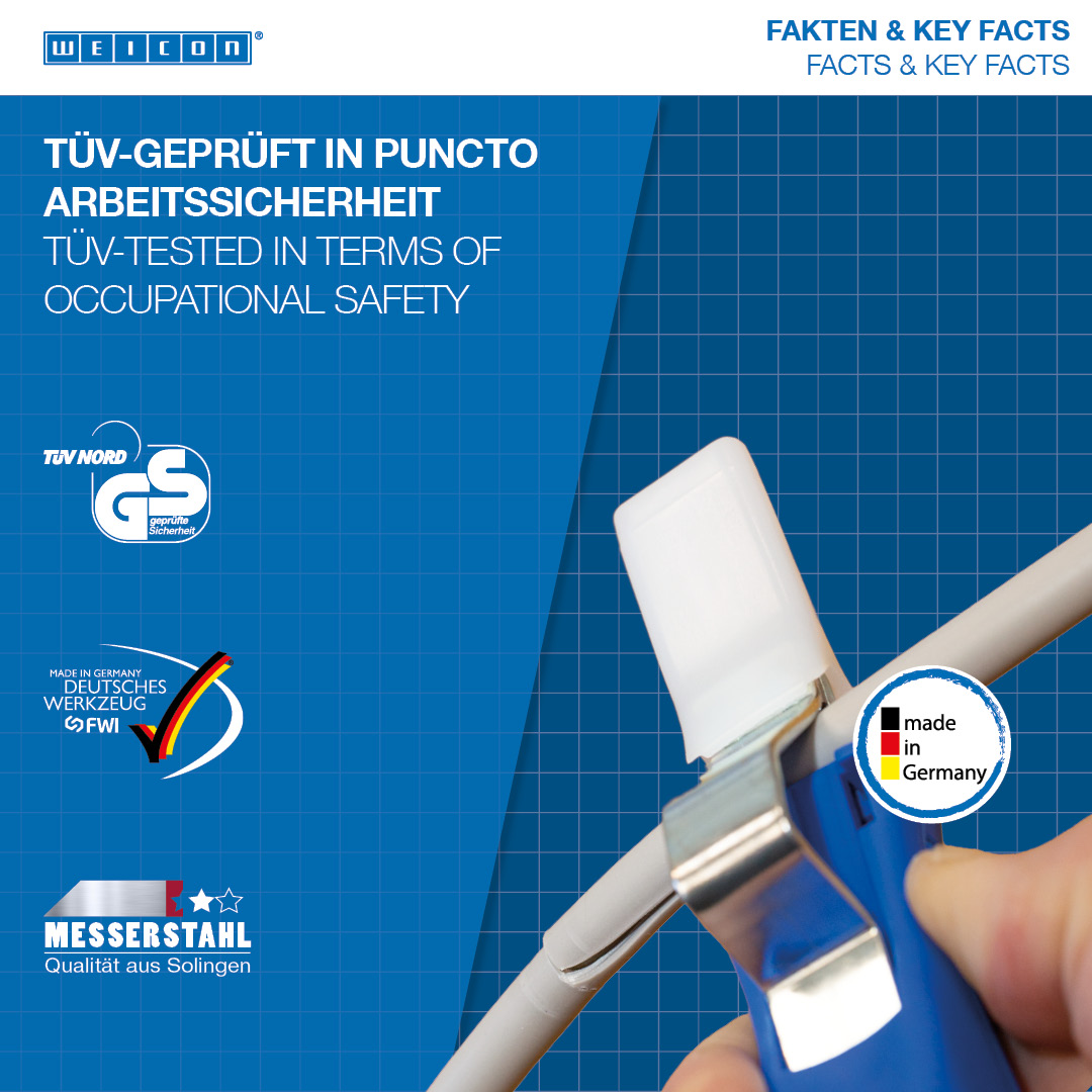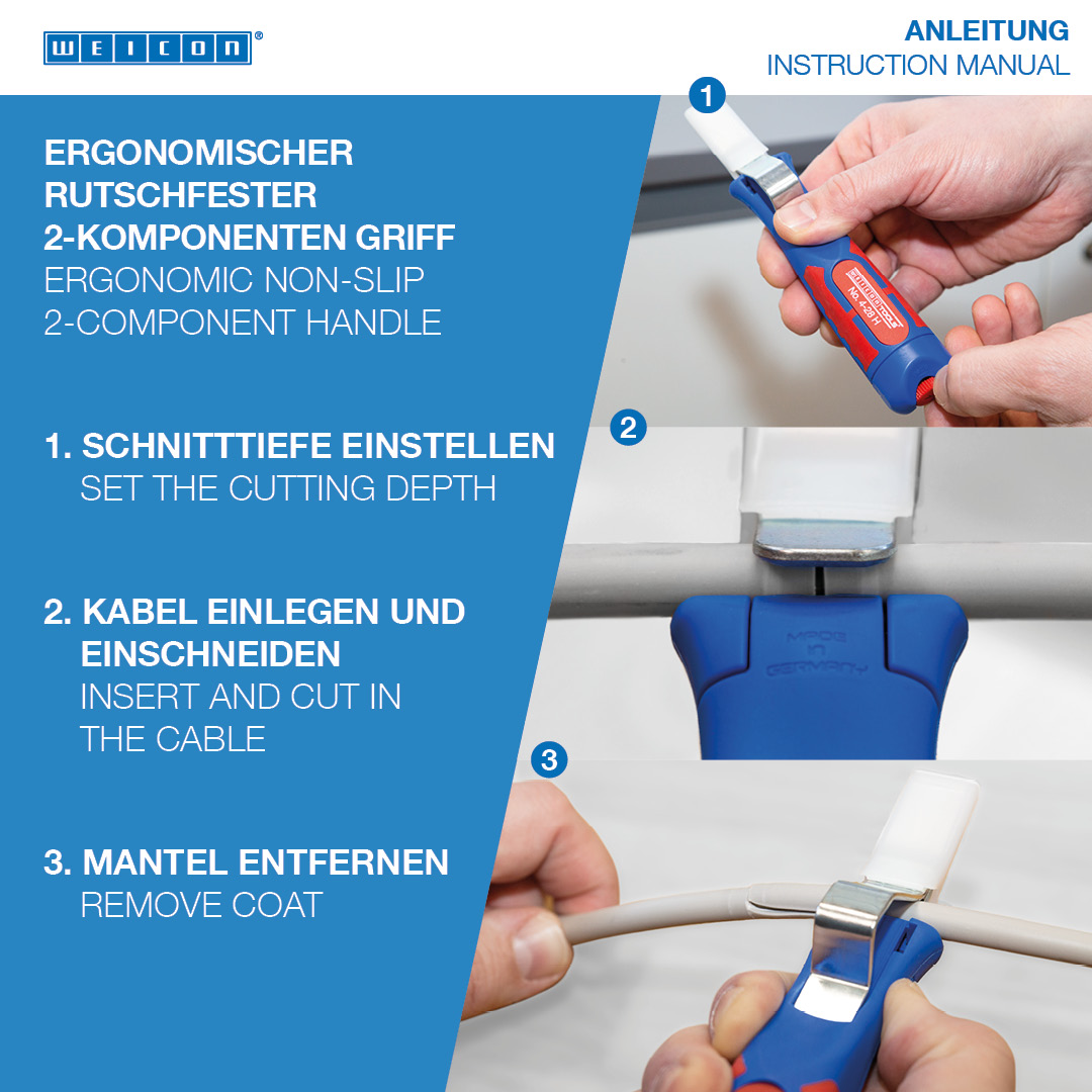 Gran diámetro del mango para una háptica óptima Tornillo de ajuste infinitamente variable y fácil de accionar Pelado preciso, rápido y seguro Cambio rápido de la cuchilla interior con cierre de bayoneta