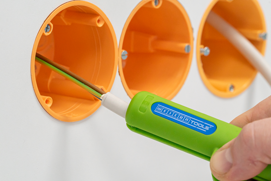 Las Herramientas Pelacables WEICON permiten pelar de forma rápida y segura todos los cables redondos habituales. La gama de productos de herramientas incluye distintos tipos, que proporcionan un manejo sencillo y resultados precisos. • Pelar sin ajustar la profundidad de corte El pelacables redondo n.º 13 permite pelar de forma rápida y cómoda todos los cables redondos y para espacios húmedos habituales con un diámetro de 6-0 - 13,0 mm (por ejemplo, cables NYM de 3 x 1,5 mm² a 5 x 2,5 mm²). No es necesario ajustar manualmente la profundidad de corte. De este modo, la nueva gama de trabajo también es adecuada para diámetros de cable más pequeños a partir de 6 mm, como 3 x 0,75 mm². • ergonomía Gracias a la forma ergonómica del mango, la herramienta resulta especialmente cómoda de utilizar. El distintivo mango garantiza que el pelacables proporcione un agarre seguro y antideslizante. Esto facilita el trabajo diario y mejora la seguridad laboral. • acceso óptimo El cabezal de la herramienta, redondeado y que ocupa poco espacio, se adapta perfectamente a la moderna geometría de la caja de pared. Su forma más alargada facilita aún más el acceso al pelar en cajas de paredes huecas profundas y espacios de difícil acceso. • Cuchillas duraderas Gracias a la nueva disposición de las cuchillas, se evita el atasco de las cuchillas electrogalvanizadas debido a los residuos de las fundas de los cables. • Precisión Para posibles series pequeñas o para producir cables con la misma longitud de banda, se integra un tope de longitud en la carcasa. El tope de longitud puede colocarse en el rango de 3 a 10 cm en pasos de 0,5 cm - Almacenamiento seguro Un clip de sujeción garantiza un almacenamiento seguro. • calidad - 100% made in Germany Fabricado en robusta poliamida reforzada con fibra de vidrio. Acero para cuchillos de alta calidad fabricado en Solingen y, por tanto, cuchillas duraderas.