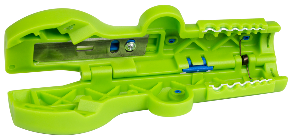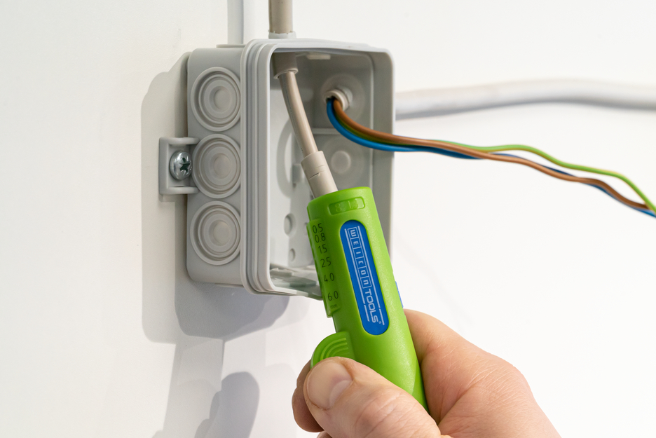 • corte redondo y longitudinal seguro, así como pelado a ras incluso en lugares de difícil acceso en techos y paredes, en cajas de derivación y distribución, armarios de distribución, etc. - sin ajuste de la profundidad de corte: la herramienta está optimizada para trabajar con cables NYM, por ejemplo, de 3 x 1,5 mm² a 5 x 2,5 mm². • forma del mango antideslizante y, por tanto, fácil manejo durante el trabajo diario • trabajo rápido y sin fatiga gracias a la nueva disposición de las cuchillas para el corte longitudinal • 100% fabricado en Alemania • fabricado en poliamida reforzada con fibra de vidrio • mango robusto, ergonómico y seguro • cuchilla de acero de alta calidad de Solingen y, por tanto, cuchillas duraderas • comprobado por TÜV/ GS en cuanto a seguridad laboral la herramienta n.º 16 es una herramienta de nuevo desarrollo para el usuario profesional de la industria y el comercio especializado. La herramienta 4 en 1 tiene varias funciones: corte circular - corte longitudinal - pelado - corte. De este modo, se pueden sustituir varias herramientas por una sola. Esto ahorra dinero y espacio en la caja de herramientas. La guía de cables óptimamente integrada en la carcasa garantiza un pelado seguro, preciso y cómodo de todos los cables redondos y para estancias húmedas habituales con un diámetro de 8,0 - 13,0 mm. (por ejemplo, cables NYM de 3 x 1,5 mm² a 5 x 2,5 mm²). Gracias a la forma ergonómica del mango, la herramienta es especialmente cómoda de usar. El característico mango garantiza que la herramienta n.º 16 proporcione un agarre seguro y antideslizante. Esto facilita el trabajo diario y mejora la seguridad laboral. Incluso en lugares de difícil acceso o en cajas de empalmes y distribución, la herramienta es adecuada para pelar cables a ras. No es necesario ajustar manualmente la profundidad de corte. Todos los cables trenzados y rígidos comunes con un diámetro de 0,5 - 6 mm² pueden mecanizarse en el sector de desaislado integrado. La herramienta universal tiene una cuchilla en forma de gancho retráctil que se puede bloquear firmemente en cualquier posición y es fácil de cambiar.