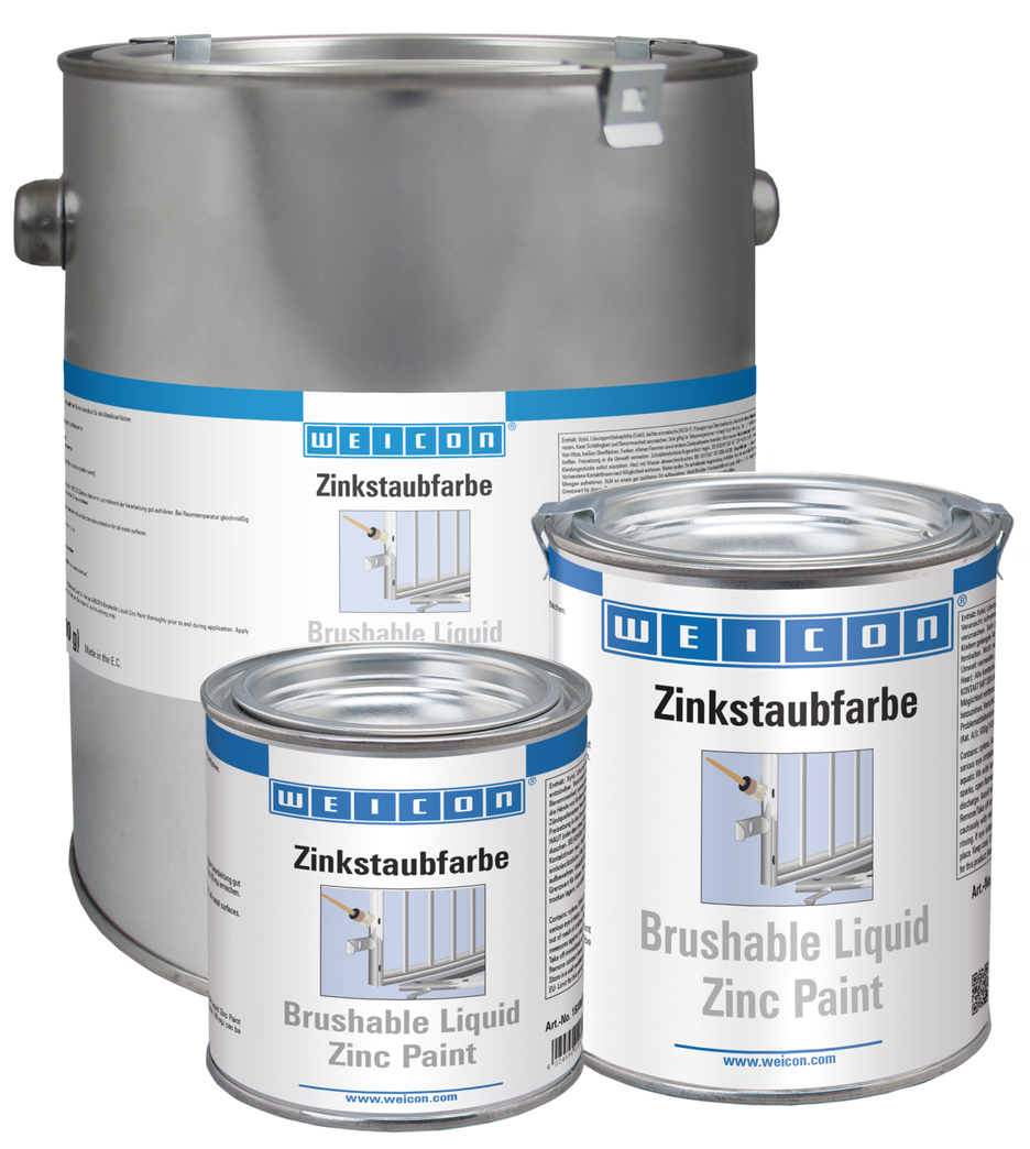 La Pintura de Zinc WEICON es un recubrimiento utilizado para la protección anticorrosiva activa de superficies metálicas. Pintura de Zinc consta de pigmentos de metal esféricos (redondos) de alta concentración y pureza. El gran contenido de zinc en el revestimiento permite obtener una eficiente protección catódica anticorrosiva. Para la reparación y el recubrimiento de marcos, portales, puertas, barandillas, mástiles, pilars, partes de máquinas etc. Si se daña la superficie, las moléculas de zinc reaccionan con la humedad del aire formando moléculas de óxido de zinc que protegen contra la corrosión el material dañado.