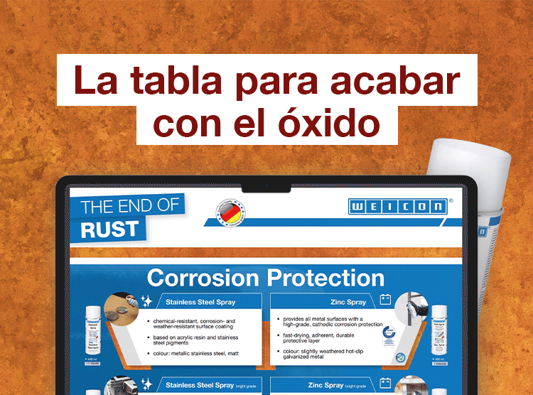 Nuestro resumen "¡Acabe con el óxido!" muestra de un vistazo qué productos WEICON son los mejores para tratar y proteger contra el óxido. Esto incluye convertidores de óxido y agentes aflojadores, así como Sprays de Zinc, revestimientos protectores y soluciones de conservación a largo plazo. De este modo, es fácil encontrar el producto adecuado para eliminar, proteger y prevenir el óxido, sea cual sea la aplicación.