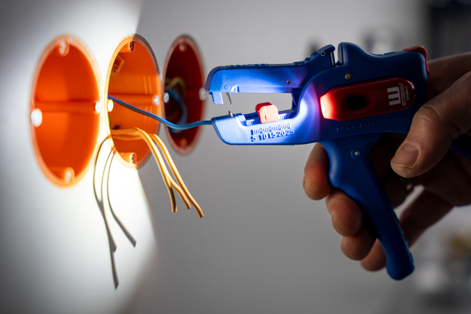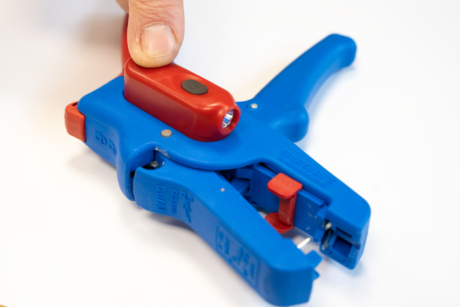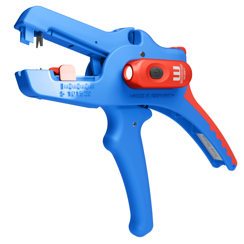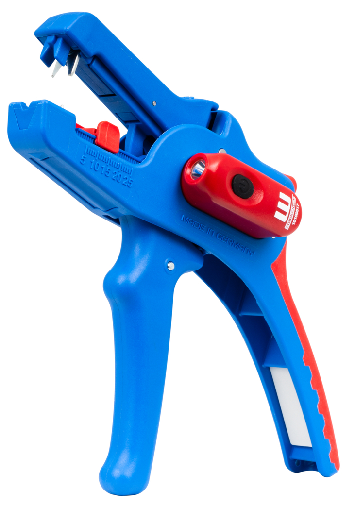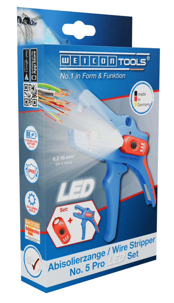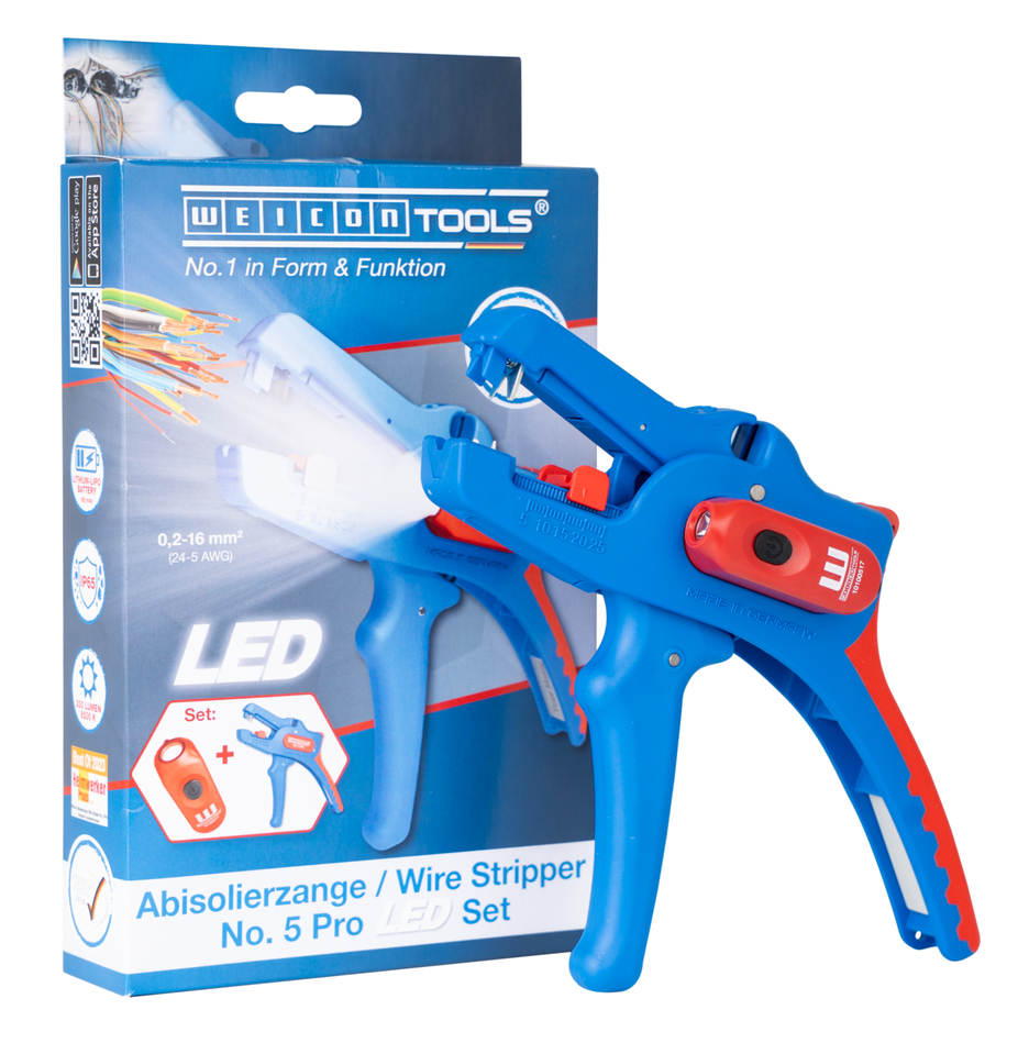 Wire Stripper No. 5 Pro: large, efficient working range from 0.2 mm² - 16 mm² | precise working due to adjustable length stop (5 - 25 mm) | integrated, easily accessible built-in side cutter up to 3 mm Ø Cu/Al |ergonomically designed anti-slip multi-component handle I LED Work Light: the integrated LED light ensures a well-illuminated working area that allows you to work safely with both hands I powerful and rechargeable lithium battery with 180 mAh I 2 hours of bright light (at level 2) after a charging time of 40 minutes I three brightness settings with up to 250 lumens, light colour: 6500K I dustproof, splash-resistant and impact-resistant housing made of polycarbonate, tested acc. to IP65 protection code I can be used with many WEICON TOOLS wire strippers