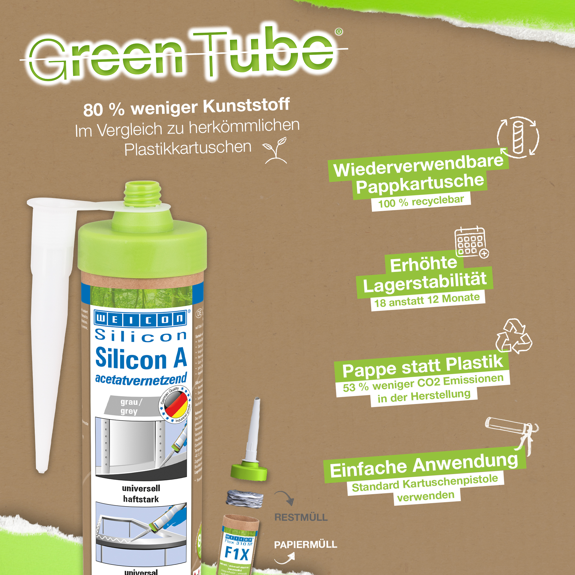 WEICON Silicona A está exento de diluyentes, con reticulante de acetato, gran fuerza adherente, elasticidad permanente, resistente al envejecimiento, a productos químicos y a las temperaturas hasta +180 °C (+356 °F), extrema elasticidad (alargamiento a la rotura >700%) y de aplicación universal. Silicona A ofrece una excelente adherencia al acero, aluminio, vidrio, cerámica y numerosos otros materiales. Silicona A puede aplicarse en la construcción de máquinas e instalaciones, en la técnica de ventilación y aire acondicionado, en la industria energética y electrotécnica, en la construcción de recintos feriales y almacenes y en una gran cantidad de otros campos industriales.