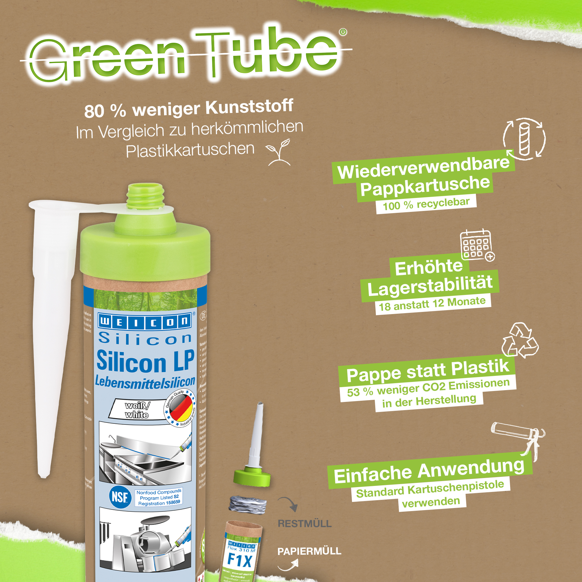 WEICON Silicona LP es un adhesivo y sellador de elasticidad permanente con reticulante de acetato. Es resistente a los productos químicos, al envejecimiento, a la intemperie y a la radiación UV y tiene una alta resistencia a la temperatura de hasta +180 °C (+356 °F). Adhiere muy bien en el acero, aluminio, vidrio, plásticos y numerosos otros materiales. La Silicona LP ha sido desarrollada especialmente para su uso en zonas sensibles. Se utiliza para el sellado en el sector alimentario y en el sector del agua potable, por ejemplo en lecherías, mataderos, en la producción de bebidas y alimentos o en cocinas de comedores. Probado por el Hygiene-Institut del Ruhrgebiet según la directiva KTW de la Agencia Federal de Medio Ambiente.