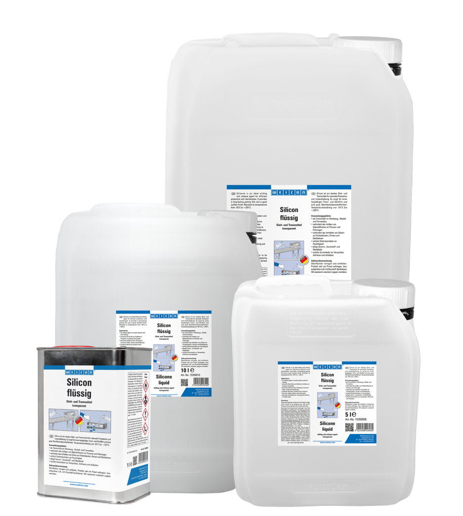 La Silicona WEICON es un lubricante y antiadherente así como agente de protección y conservación para plásticos, goma y metal. La Silicona WEICON proporciona una duradera película separadora y un buen acabado de superficie. Evita la formación de residuos de adhesivo en prensas y guías, la adherencia de productos sobre las cintas de transporte, canaletas y vías de deslizamiento. La Silicona WEICON protege los contactos eléctricos contra la humedad, conserva piezas de goma, plástico y metal, protege las piezas de goma contra fragilización, congelación y adherencia, conserva la marcha suave de los rieles de techos corredizos, de asientos y rodillos de cinturones de seguridad.