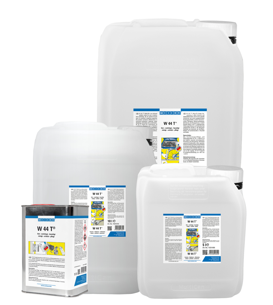 WEICON W 44 T es un aceite multifuncional que combina en sí la protección anticorrosiva, la eliminación de agua, la lubricación, la conservación y limpieza gracias a la fórmula especial y a las excelentes propiedades de escurrimiento del producto. Afloja uniones atornilladas, pernos, grifería y válvulas agarrotadas, penetra y afloja el óxido, repele la humedad de contactos eléctricos, evita las corrientes de fuga y facilita el arranque de motores. El W 44 T también es adecuado como aceite de corte para realizar perforaciones y operaciones de corte. Elimina chirridos y crujidos de bisagras, guías, cojinetes y de articulaciones y acoples de todo tipo y limpia superficies metálicas sucias. W 44 T forma una fina película de larga adherencia que no engrasa ni pega, ni atrae el polvo, protege y conserva todas las herramientas, máquinas, equipos de precisión eléctricos y mecánicos manteniéndolos operables.