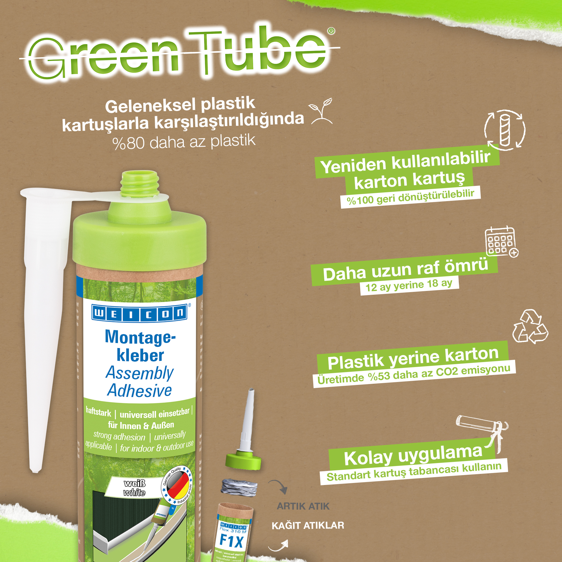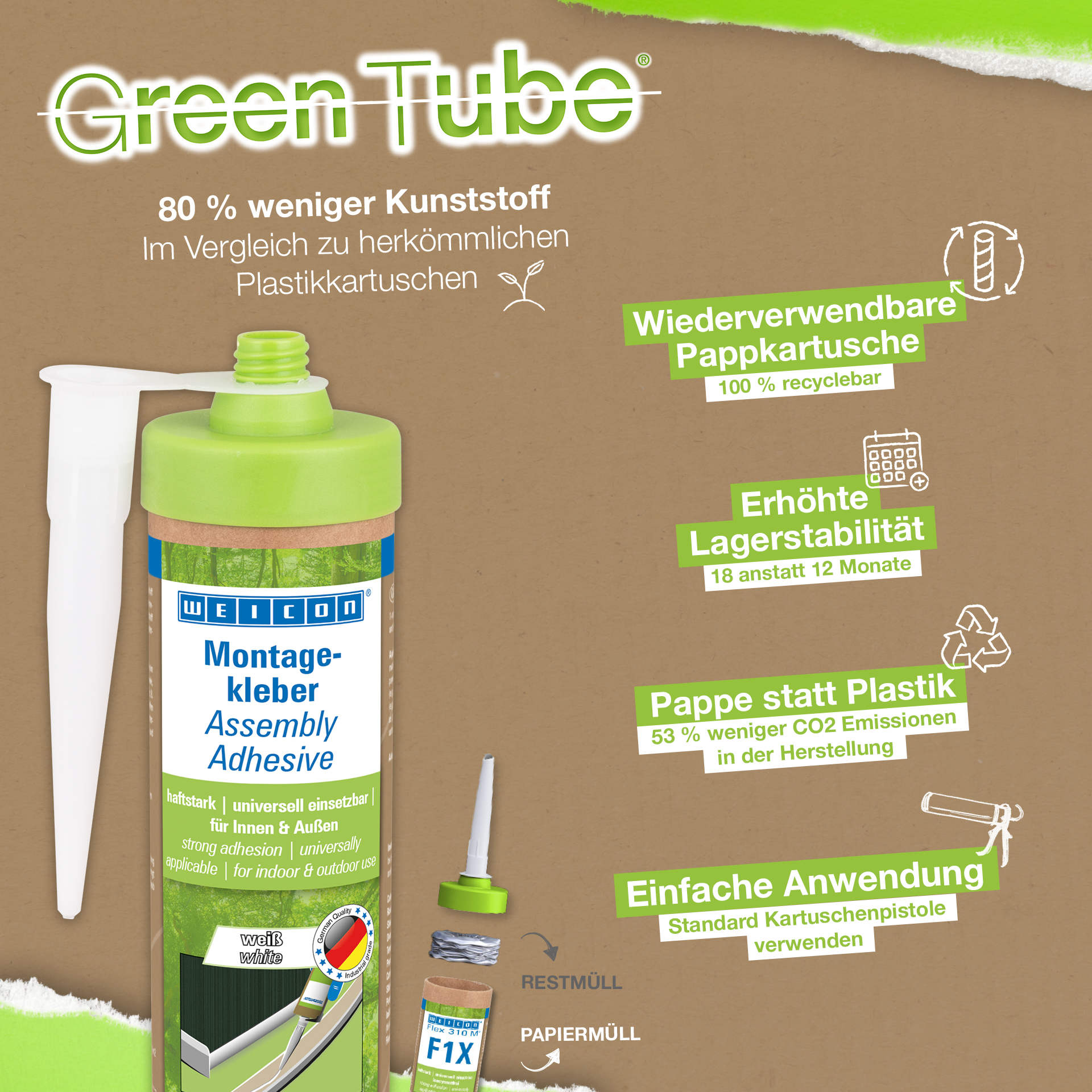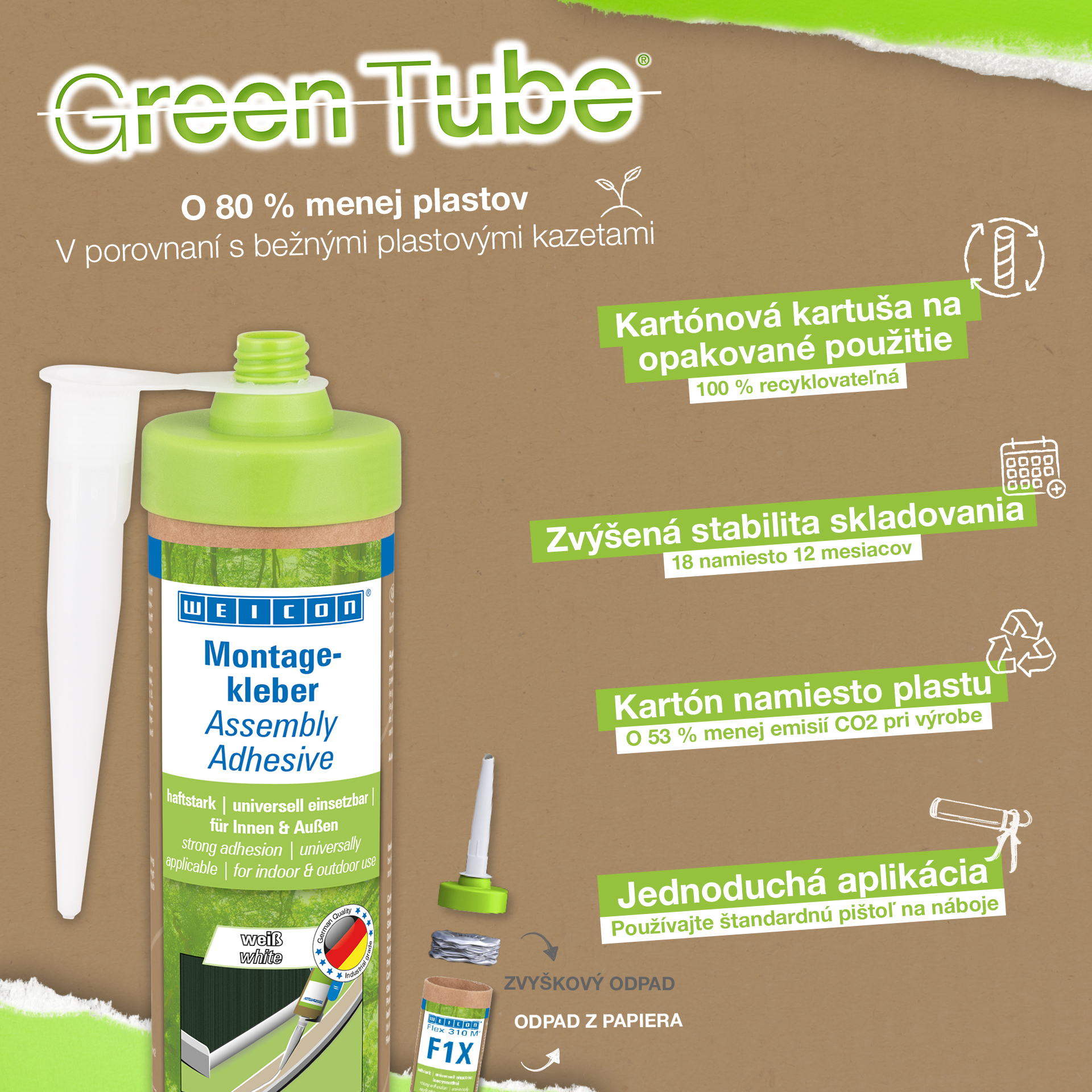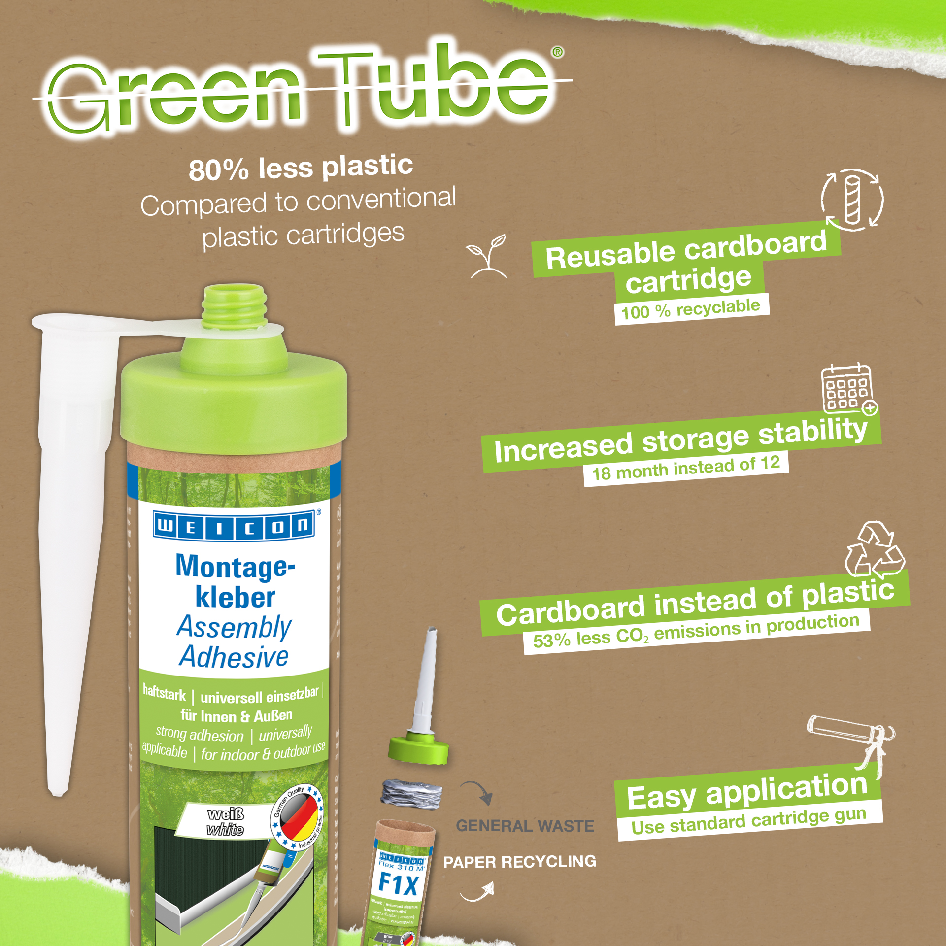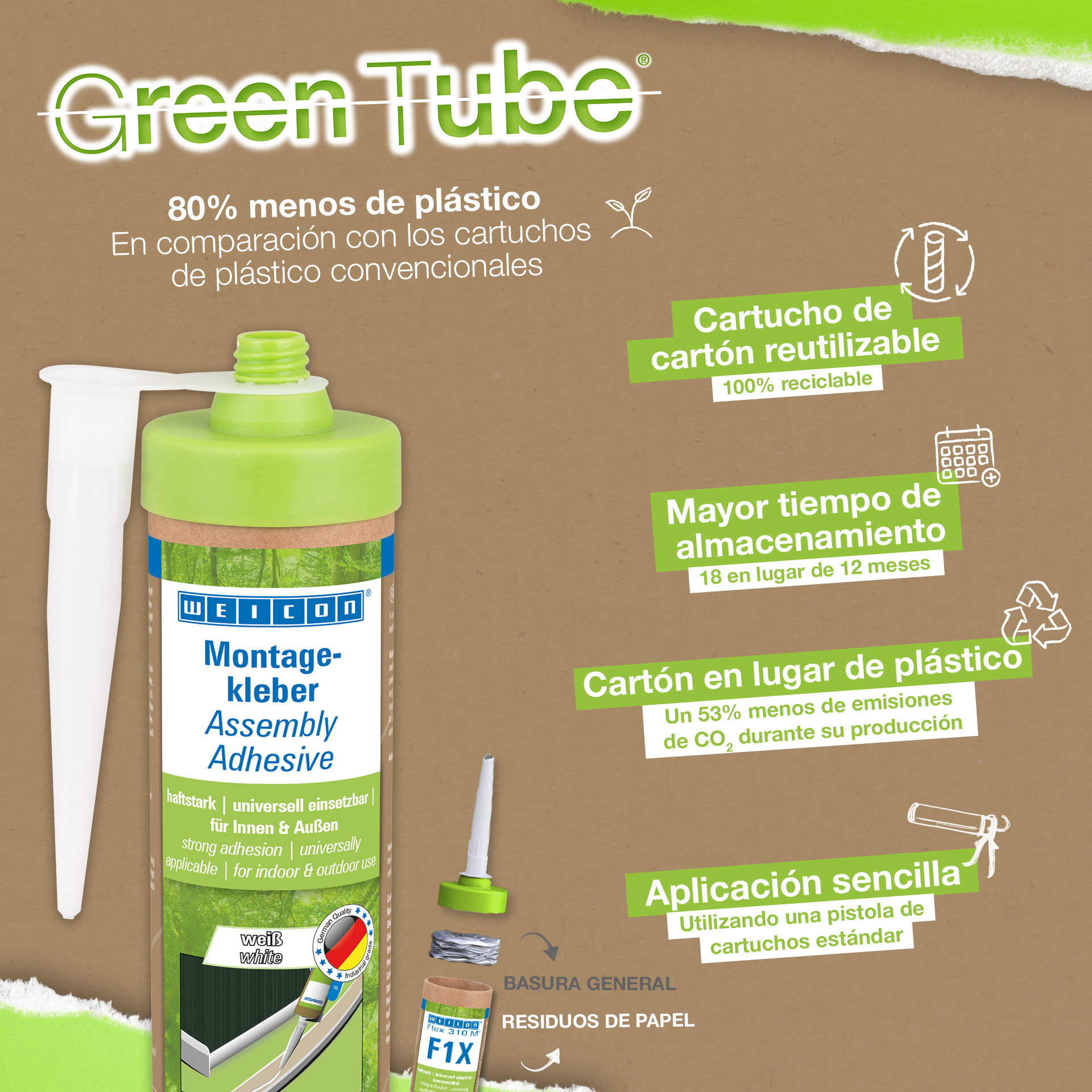 WEICON Green Tube Adhesivo de Montaje es un adhesivo acrílico de dispersión fuerte para trabajos de montaje, reparación y retoque. El adhesivo tiene una alta adhesión inicial y resistencia final, y cura rápidamente. Una vez curado, el adhesivo de montaje puede lijarse y servir de recubrimiento, además pintarse con pinturas y barnices convencionales. El adhesivo es resistente a la temperatura en un rango de -20°C a +80°C y es adecuado para aplicaciones tanto en interiores como en exteriores. Es un adhesivo flexible, de color blanco, bajo en emisiones y no contiene disolventes. WEICON Green Tube Adhesivo de Montaje es de aplicación universal y puede utilizarse para una gran variedad de necesidades. Es ideal, por ejemplo, para el pegado superficial de materiales derivados de la madera (como rodapiés, molduras decorativas, paneles o tableros aglomerados), PVC, poliestireno, placas de espuma de poliestireno, espuma rígida de PU (por ejemplo, placas aislantes y conductos de cables), materiales minerales (por ejemplo, baldosas) y metales sobre sustratos absorbentes como yeso, hormigón, fibrocemento, placas de yeso y madera sin tratar. Envase ecológico: ¡el mismo rendimiento! Green Tube, el envase sostenible: la punta y la tapa están fabricadas con plástico 100% reciclado, y el cuerpo del cartucho es totalmente de cartón. Esto se refleja en menos emisiones de CO₂ y en un menor uso de plástico en comparación con los cartuchos convencionales, ¡todo ello sin afectar a la calidad!